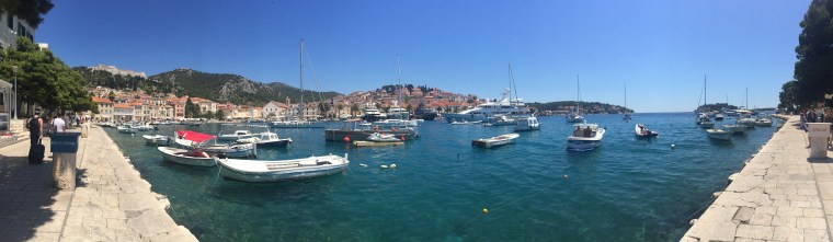 Hvar was what we were expecting plus a thousand times. We loved staying on Hvar and wish our 3 nights were more like 5! The island is a destination for many Europeans for holiday and stag and hen parties. It’s an island of beautiful people, yachts, delicious food and authentic culture. Though the island is full of travelers, the locals that live in the homes above the main square keep the tradition of cooking famous Dalmatian recipes which you can smell from a far, they enjoy the company of their neighbors by sitting outside conversing and playing cards and keeping their businesses open by selling their crafted goods. Hvar revolves around boats….taxi boats, holiday boats, fishing boats and ferries. In the next two posts (yes, we are tributing two posts to Hvar since we loved it SOOO much), we will be sharing the sights we saw, restaurants we ate at, where we had fun, our accommodations and where to shop! Enjoy!! (Because we sure did!)