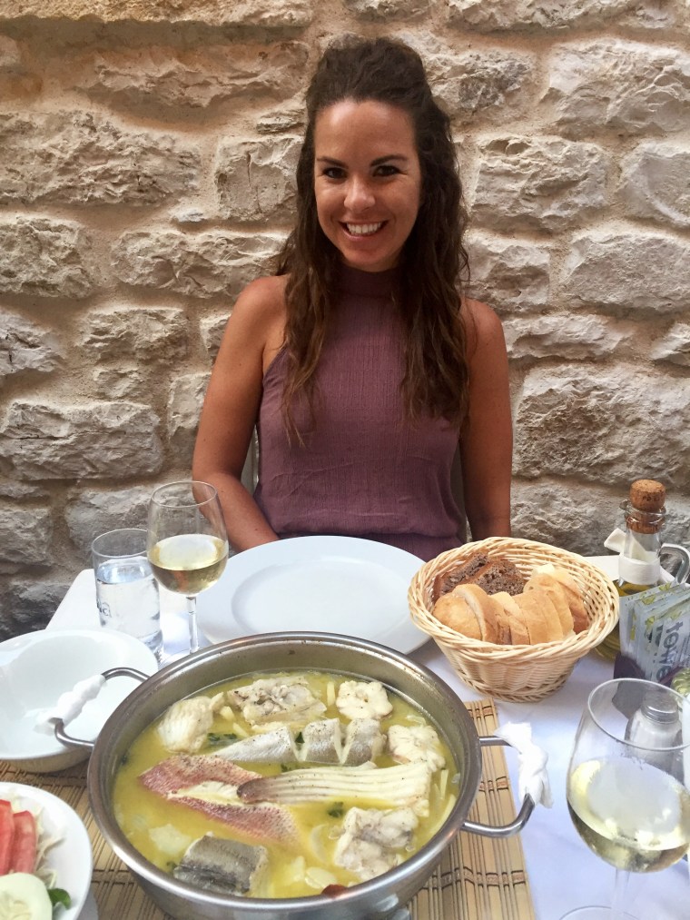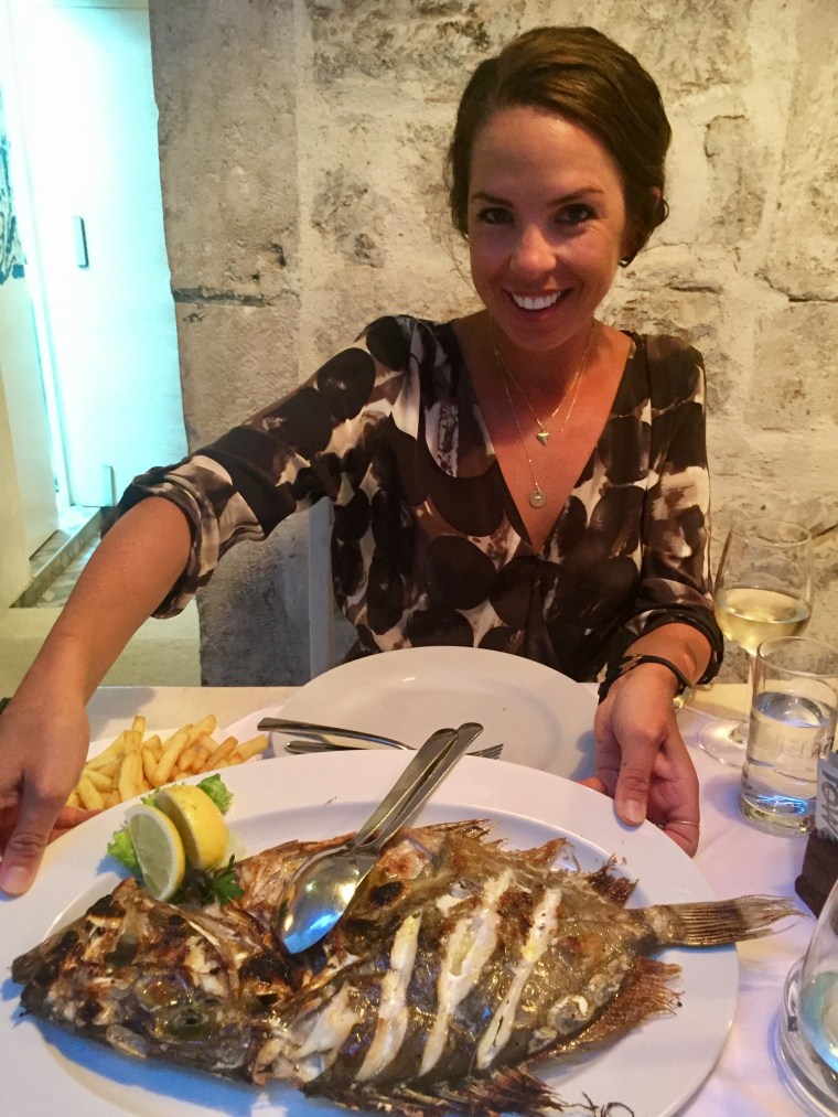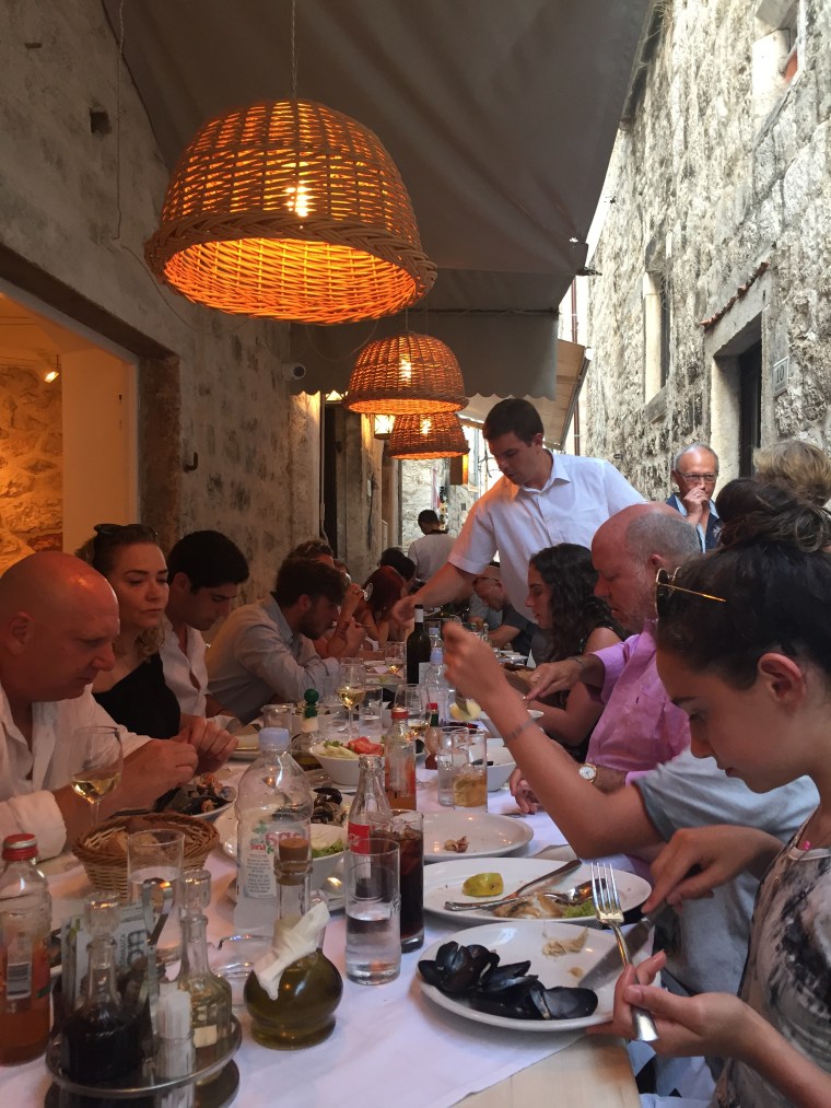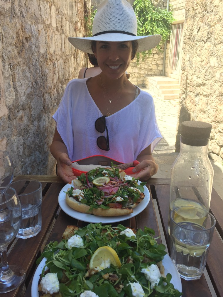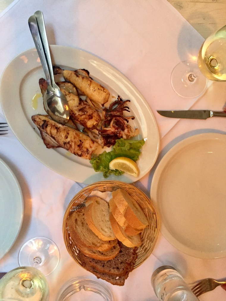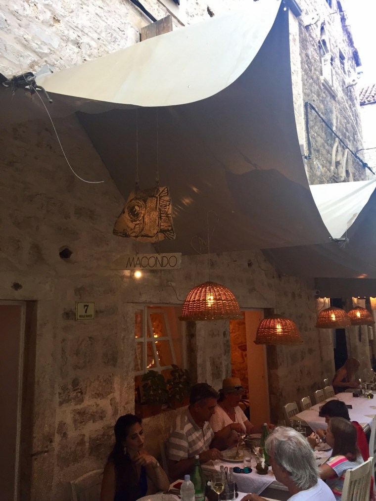 We had discovered Macondo on a food blog and were so excited to eat there. From the photos we saw online, the restaurant looked so cute, quant and authentic with a modern feel. The food even better! We went here on our second night in Hvar and sat outside in the front alley. (In our opinion, the best place since it offered the coolest, most lovely experience.) We ordered the seafood pasta to start with a bottle of white wine and for the main their Dalmatian special the fish of the day. It was so delightful – full of flavor, savory and perfectly cooked. The waiters were friendly and enjoyed chatting with us. Since we loved it so much we decided to go back on the last night and order wine, the grilled squid and whole fish. Again, we were happily satisfied with our selections. This time at dinner we sat next to a lovely group from London….made for a fun social dinner!