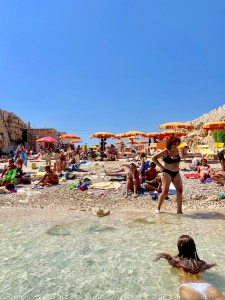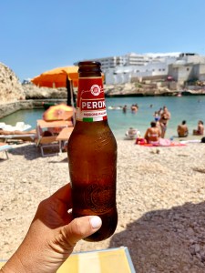 Instead of hanging out at the crowded Cala Porto, we headed to Lido Cala Paura, just about a 10 minute walk from Old Town. Not that we didn’t like Cala Porto, it just was crowed and we wanted some lounge chairs. Lido Cala Paura is low key and popular with the local Italians. We paid for chairs, €6 each including an umbrella. DEAL! We grabbed some Peronis and relaxed for a couple hours. To note, water shoes recommend!
