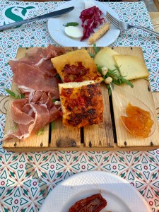 The outside ambiance brought us to this restaurant for an apertivo. Caffe Serafini had used Monkey 47 gin bottles as the vases and made it look so elegant. We had some drinks (Aperol Spritz, obviously!) and a cheese and charcuterie board. It was the perfect place to grab a bite while we enjoyed the settings of the piazza across from us fill up with people for the book festival that was going on in the city.