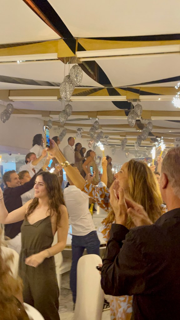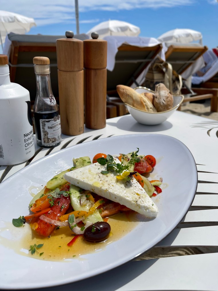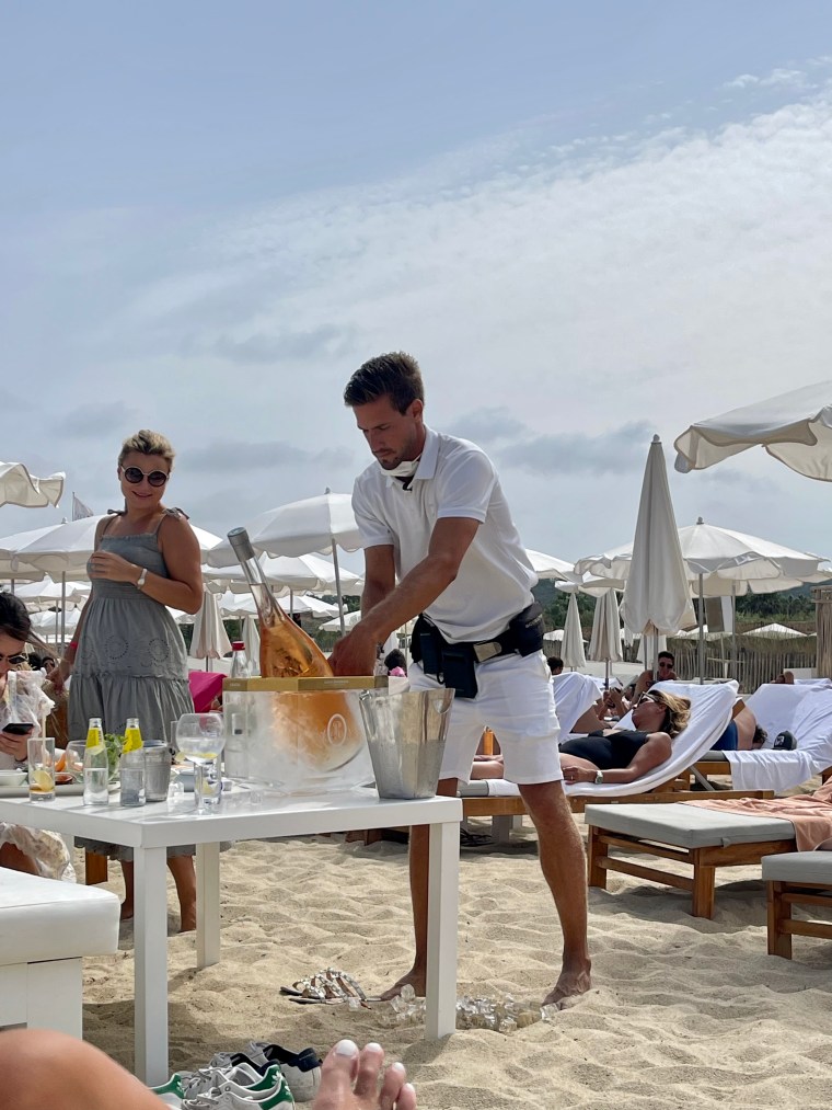 Our first beach club in Saint-Tropez was at Les Palmiers. We had some friends from Italy in town who we met up with for lunch and beach time. Being in a group made the trip even more fun especially during lunches when the music went up and people started to dance. Just to give perspective of the day, it started with the 6L (Imperial/Methuselah) bottle of Minuty rosé . (images below) Les Palmiers beach club amentities were great! They had nice sun loungers, service and restaurant. The food was delicious – fresh vegetables, fish, pasta, salads, appetizers just to name a few. We loved Les Palmiers so much we went back a second time! If you go there, make sure to say hi to Margot – she is the best server. Fun times and memories at Les Palmiers!