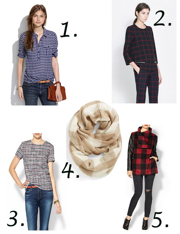 1. Mini-plaid market popover by Madewell ; 2. Checked Top with Zips by Zara; 3. Eddie Tweed Blouse by Rhyme Los Angeles ;4. Camel Plaid Scarf by Tildon; 5. Plaid Vegan Leather Sleeve Coat by Hive & Honey