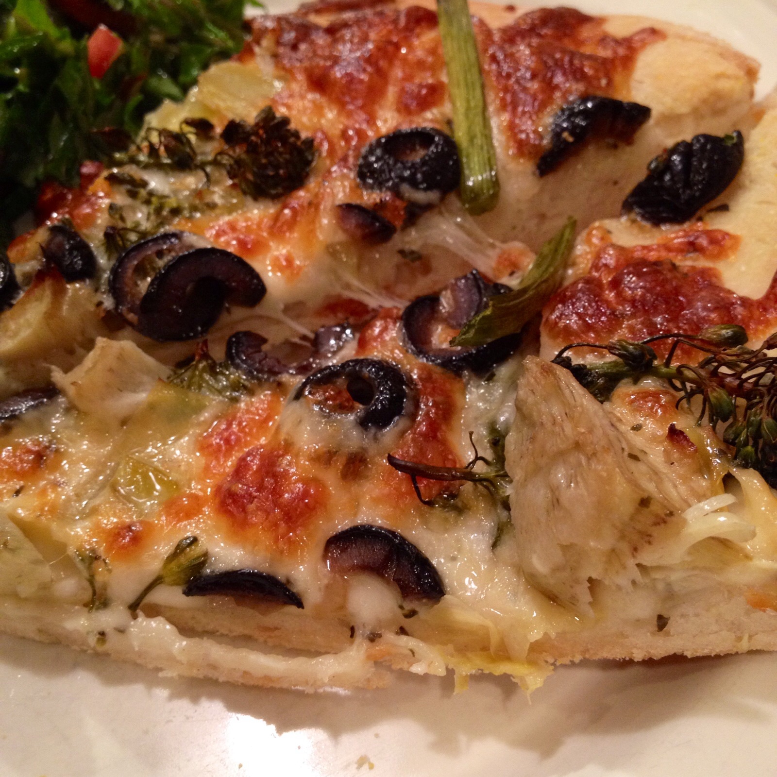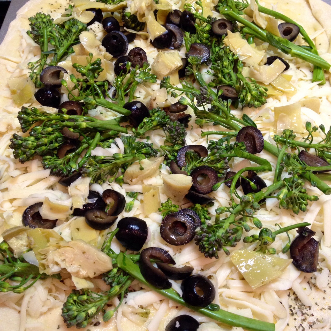 Add your mozzarella cheese, followed by the broccolini, artichokes and olives. Spread the toppings evenly.