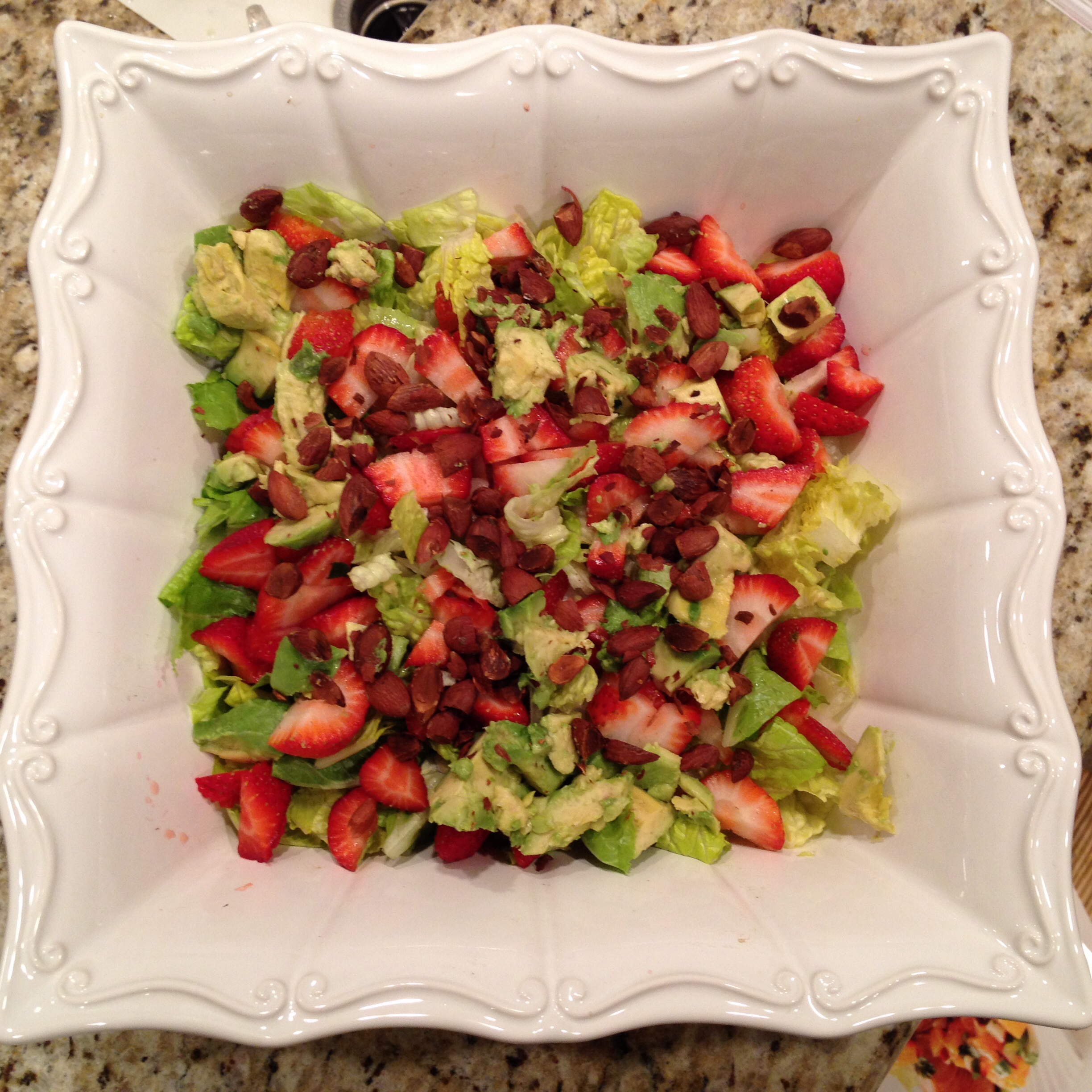 In a salad bowl/serving bowl, add the leafy greens, avocado and roasted almonds. Drizzle your desired amount of the dressing and lightly toss. Service with your favorite entrée or add protein like chicken or steak.