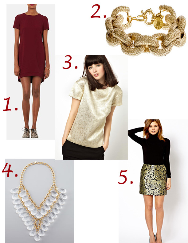 1. Topshop Crepe Shift Dress; 2. J.Crew Classic Pave Link Bracelet; 3. Boutique by Jaeger Top in Woven Jacquard 4. Kenneth Jay Lane: Teardrop-Beaded Statement Necklace; 5.Warehouse Gold Jacquard Skirt