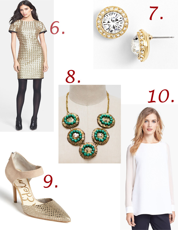 6. Ted Baker: ‘Tabie’ Sequin Sheath Dress; 7. Givenchy Studded Earrings; 8. 31 Bits Emerald City Necklace; 9. Sam Edelman: Delta Pump; 10. Theory: Toska Blouse