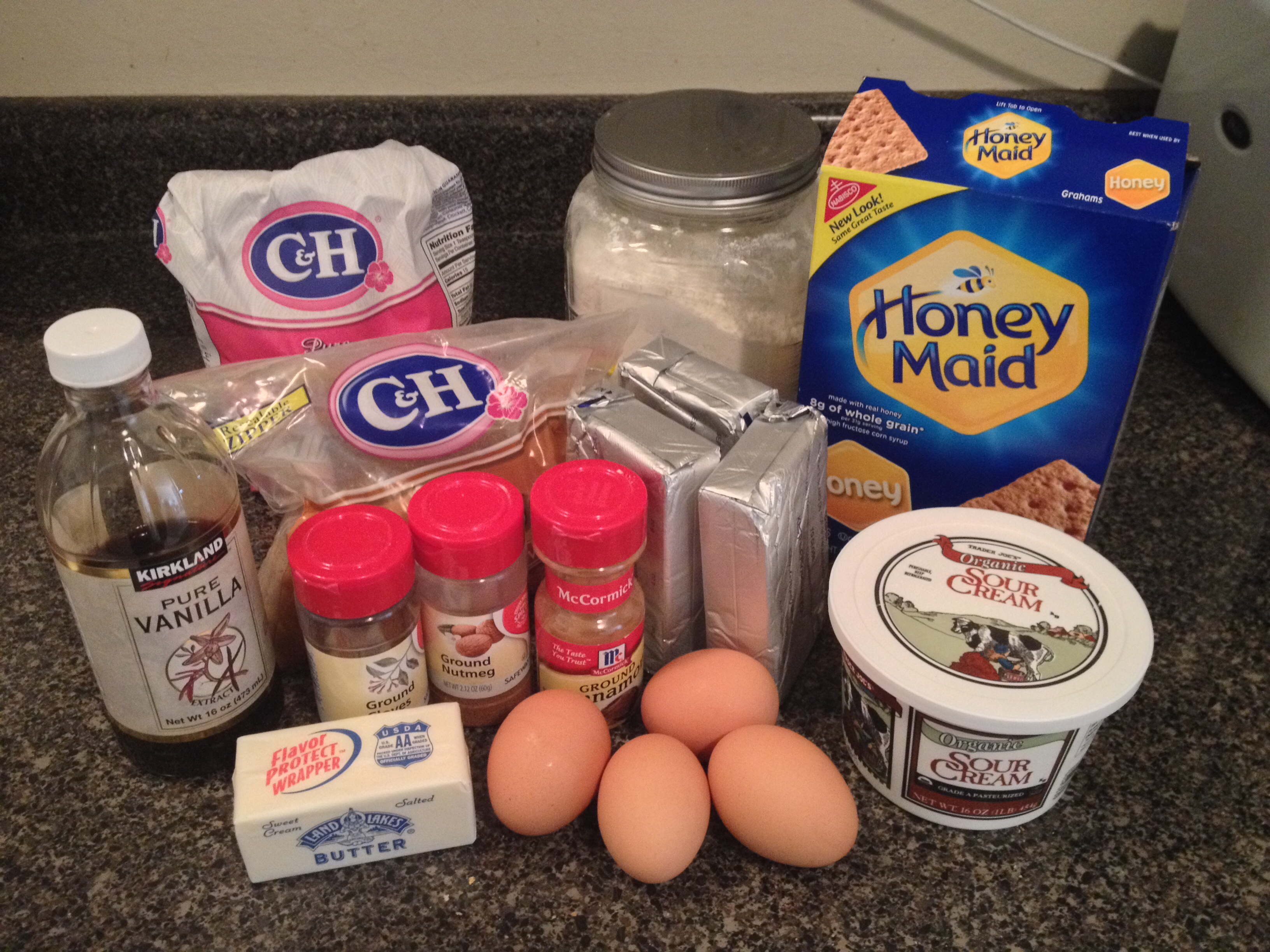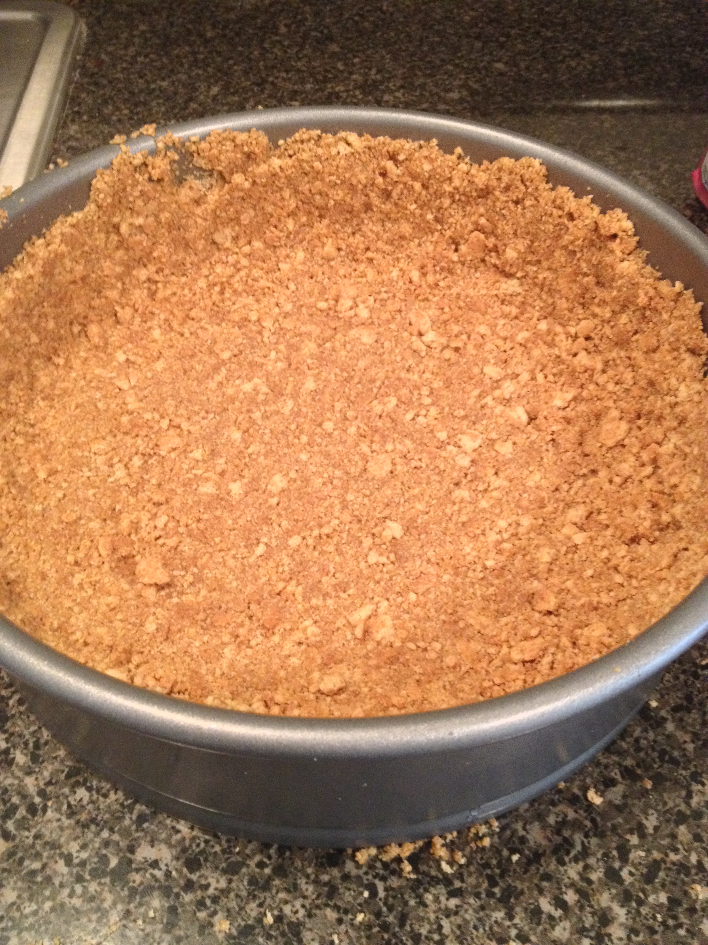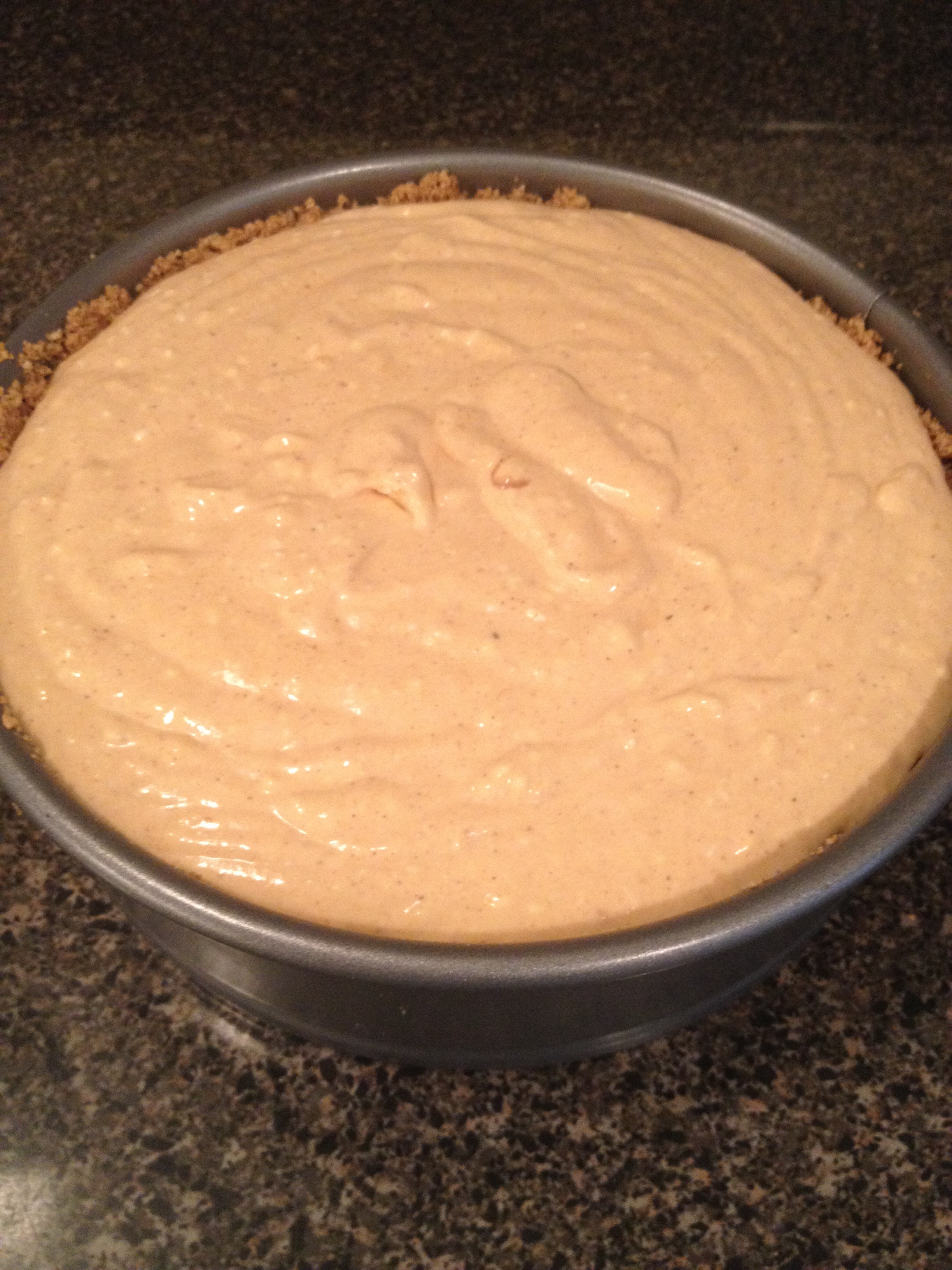 In a bowl, mix the graham cracker crumbs, sugar, cinnamon, nutmeg and butter. Create crust by pressing this mixture to the bottom and sides of a 9-inch springform pan. Put aside.