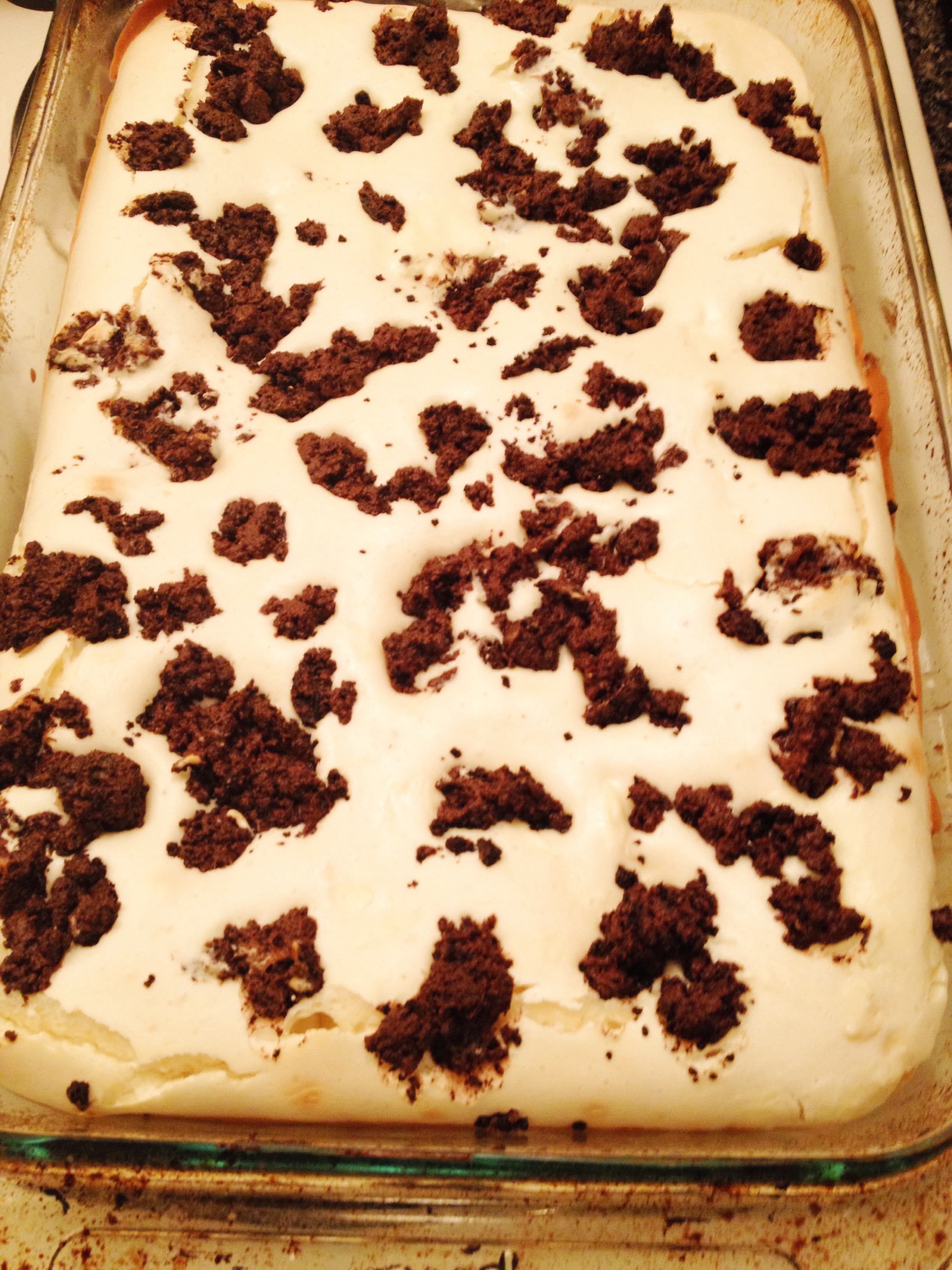 Heat chocolate chips and butter in a microwave-safe bowl. Once the morsels are melted, add the Oreo crumbs to the chocolate. Place ¾ the mixture in the bottom of a 9×13 pan. Make sure it is spread evenly. Set aside.