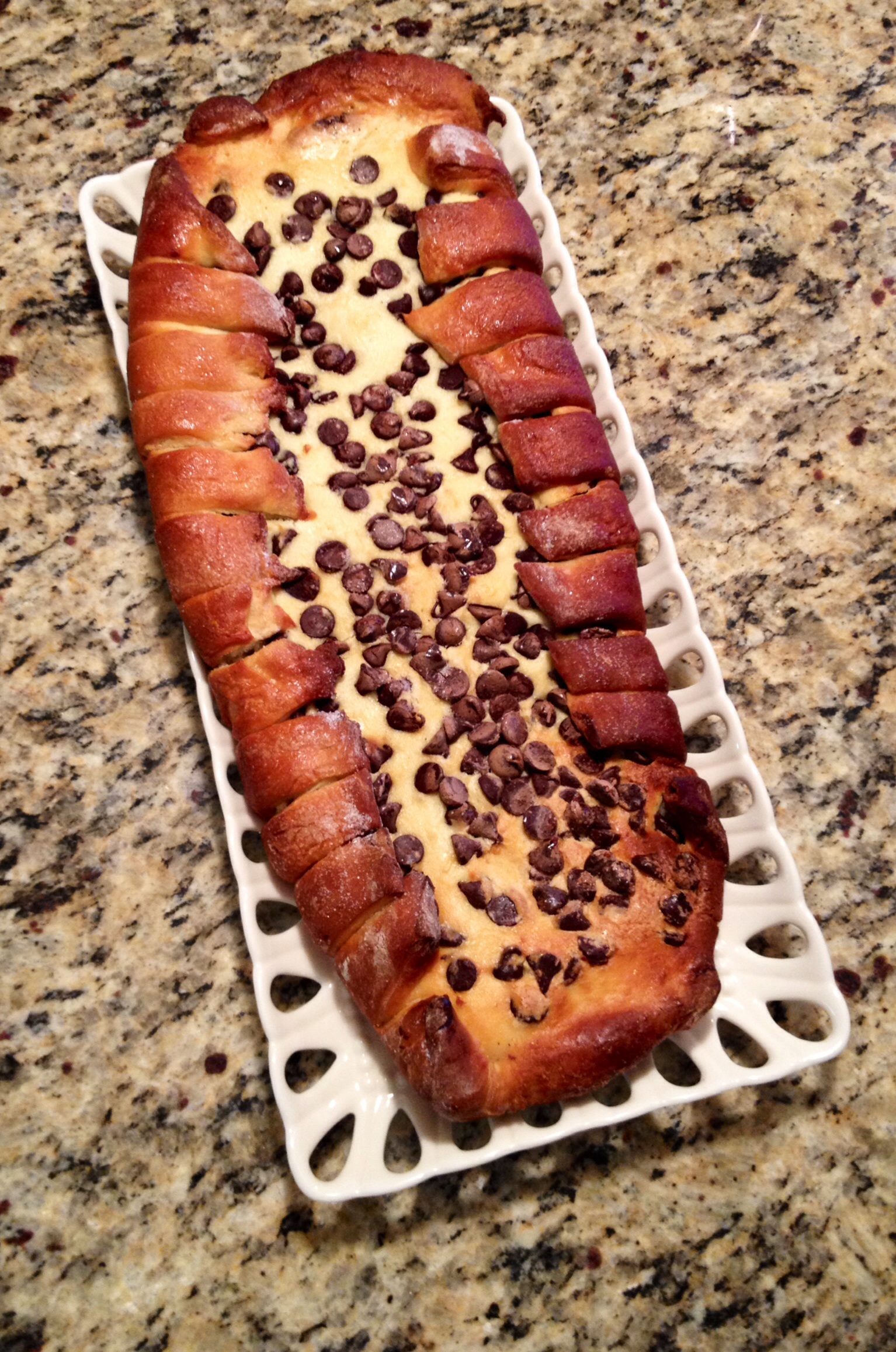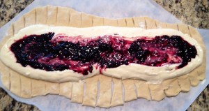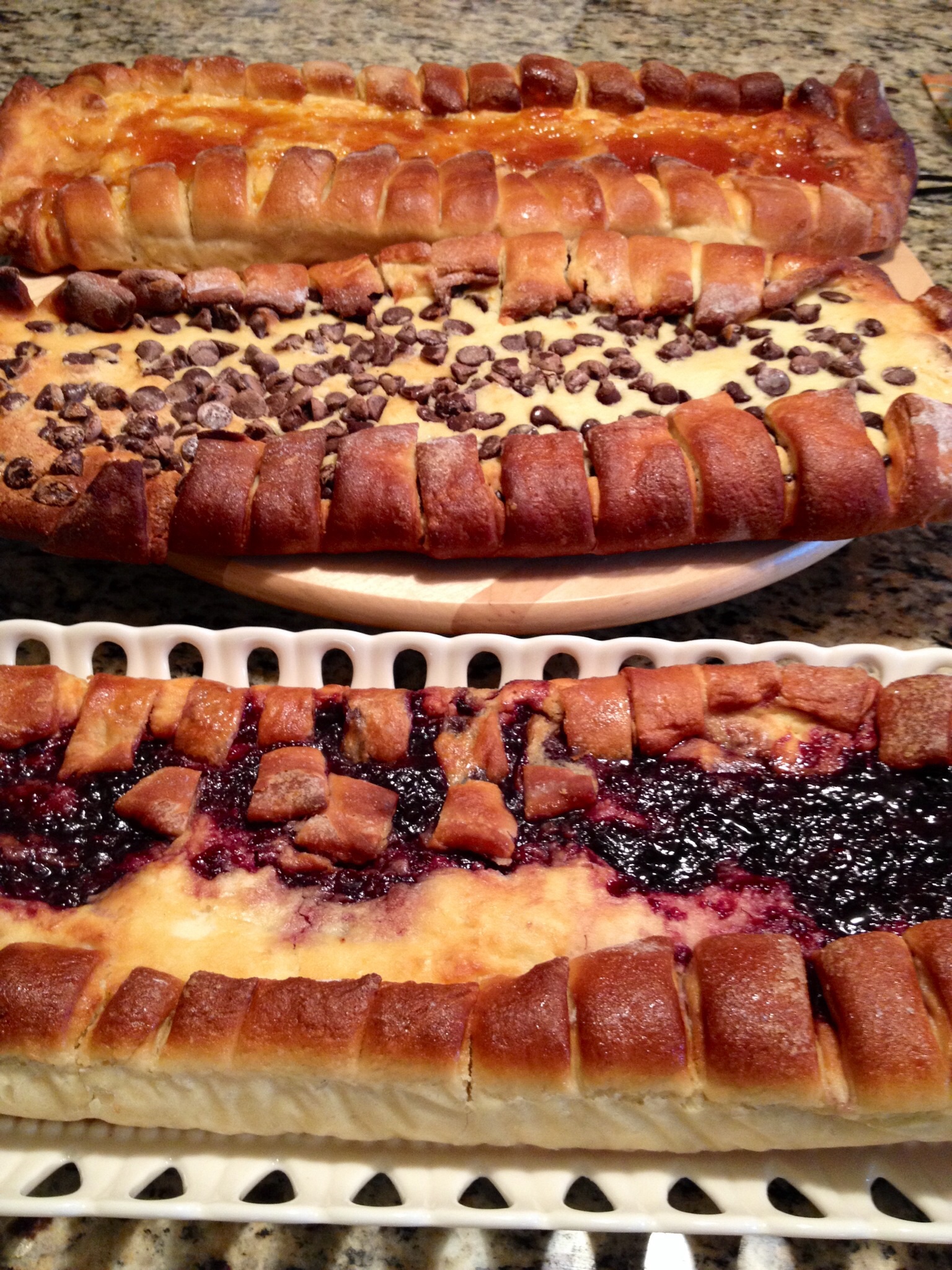 *T.W.O. doubled the recipe and made 3 large braids. They used apricot jam, boysenberry preserves and chocolate chips.