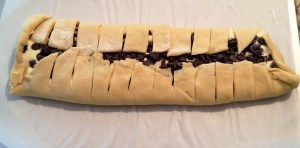Spread the cream cheese filling in the middle of the dough. Top with your favorite jam or chocolate chips. Cut 1 inch wide strips around the edge of the dough. Fold the strips towards the middle to create a lattice top.