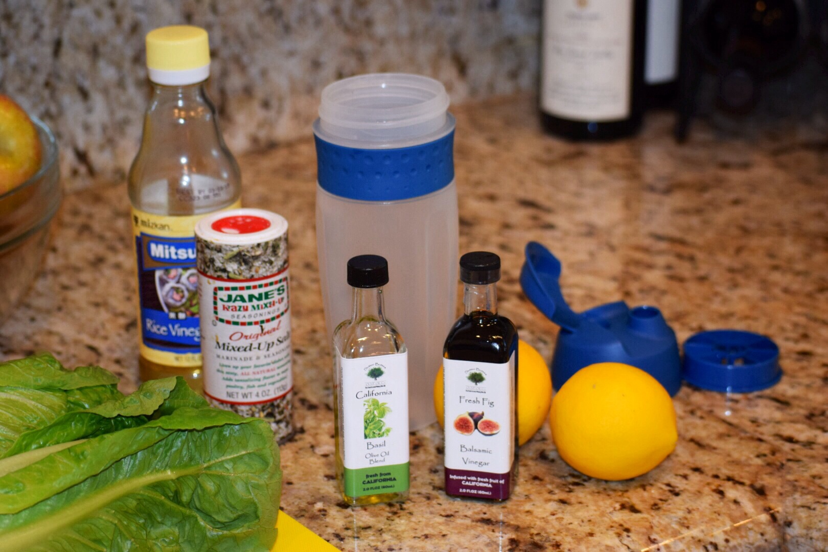 - For the dressing: combine the, basil olive oil, fig balsamic, rice vinegar, lemon juice, salt and pepper. Mix well and set aside.