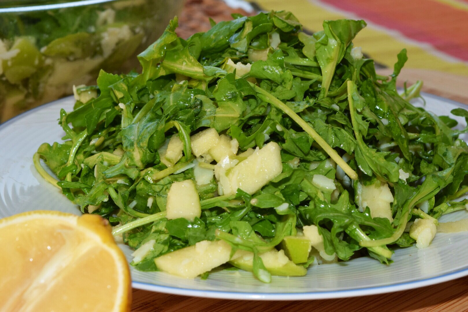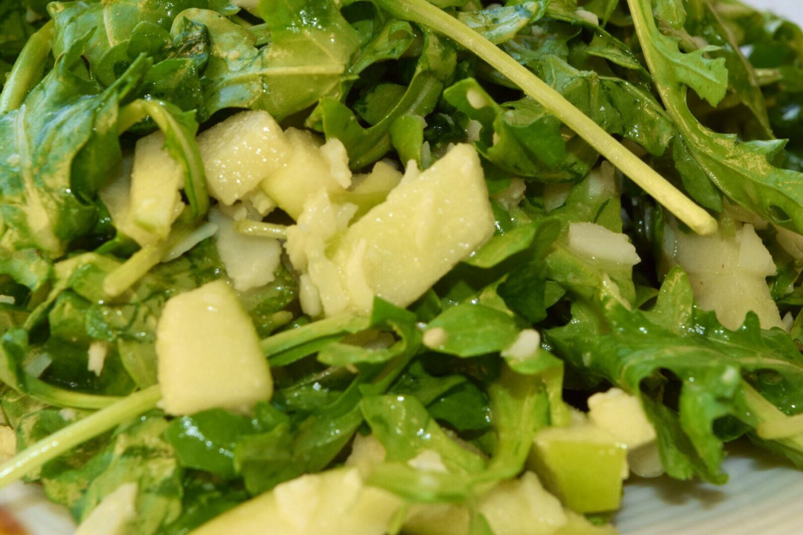 1.Add the arugula to a bowl. Thinly slice the green apple and add to the lettuce. Top with shaved parmesan.