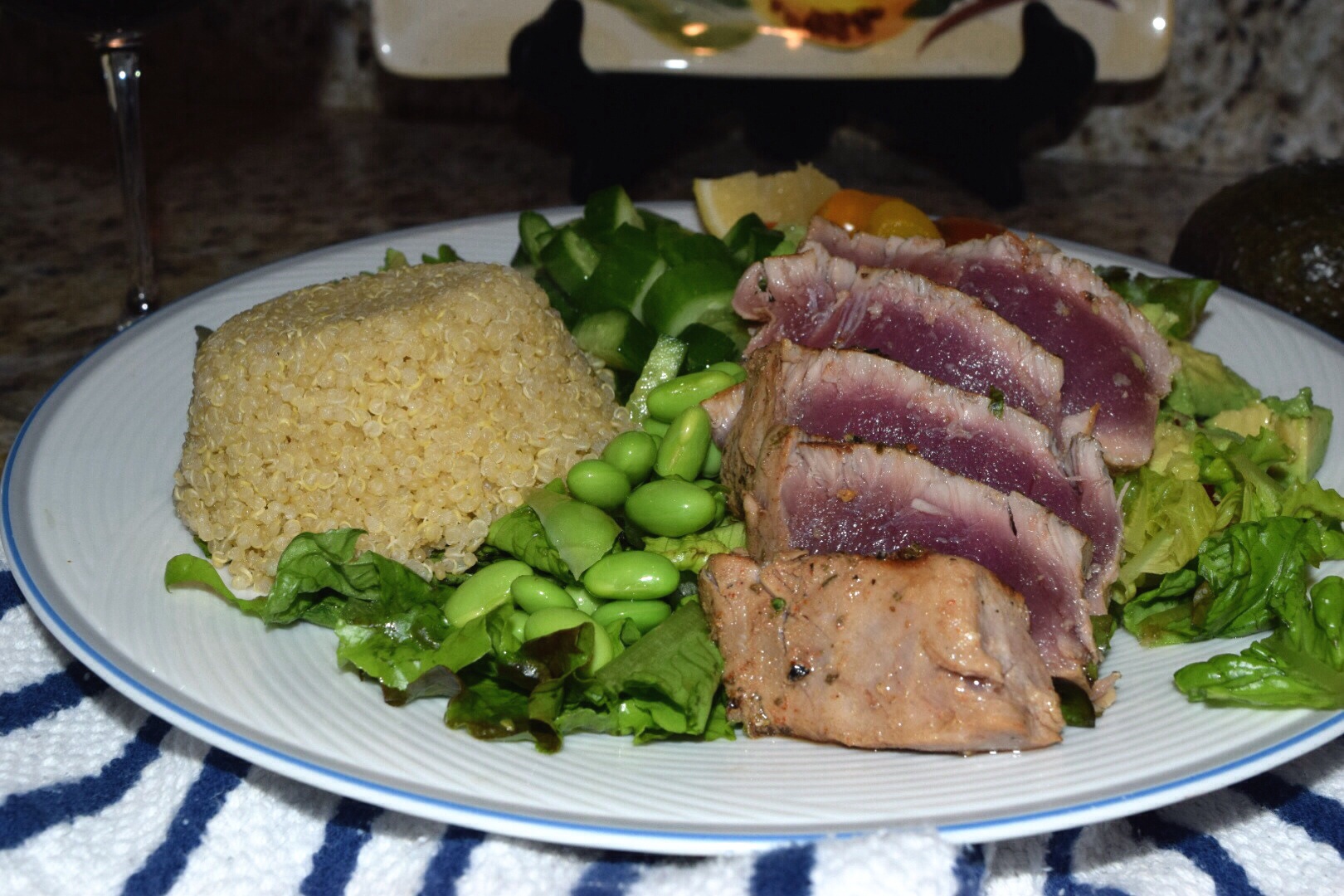 1. Put the ahi steaks on a plate. Marinate with lemon, cayenne pepper, soy sauce, garlic powder, pepper and salt. Set aside and let sit for 15 minutes.