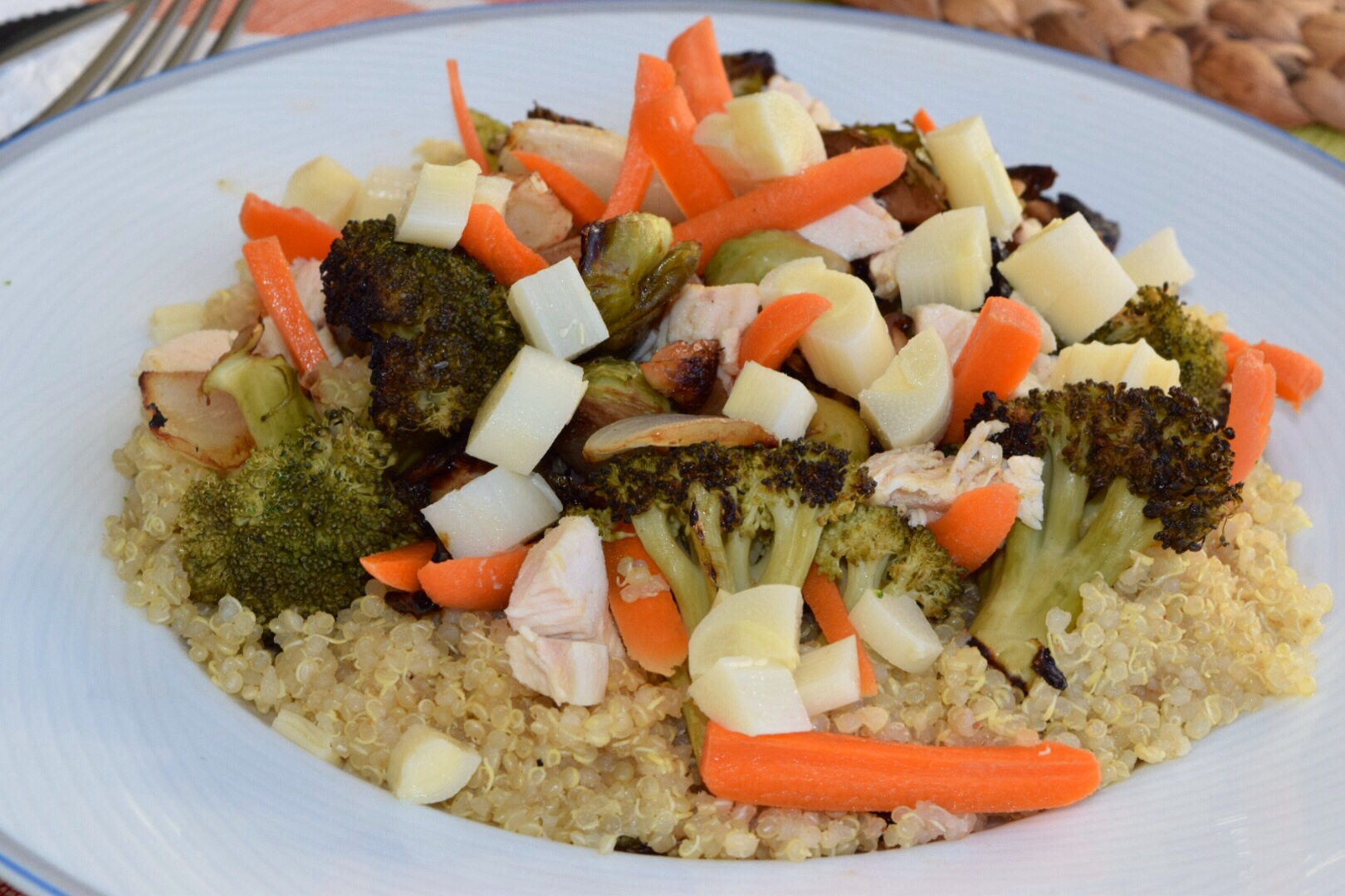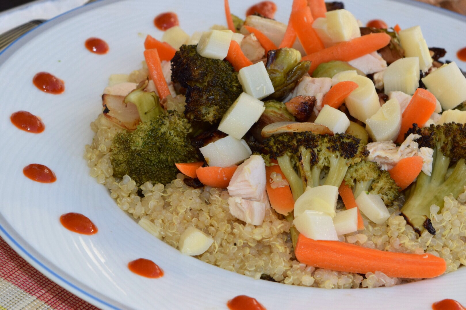 5. Plate the quinoa, top with the vegetables and sliced chicken. Top with sriracha.
