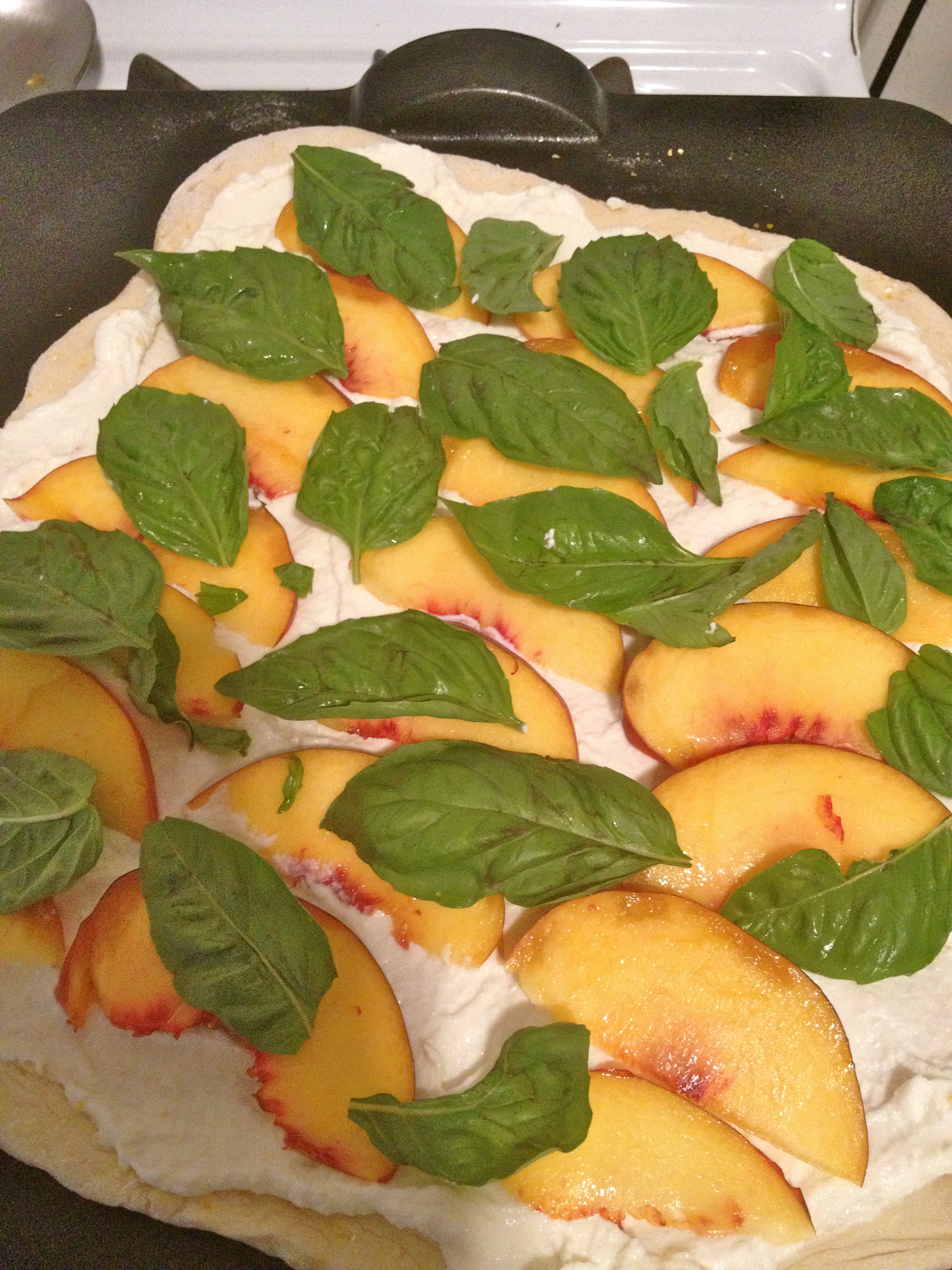 Now it’s ricotta time! First, add the honey to the ricotta and mix well.  Spread the ricotta/ honey mixture evenly on the dough. Make sure your spread it all the way to the edges. Thinly slice the peaches and remove the stems from the basil.  Next, place the peaches and basil on the ricotta.  Once the pizza is “dressed,” start the BBQ.  It is important to make sure the BBQ is pre-heated so that it cooks at the set temperature.  (The temperature should be around 414° – 450° depending on your BBQ)