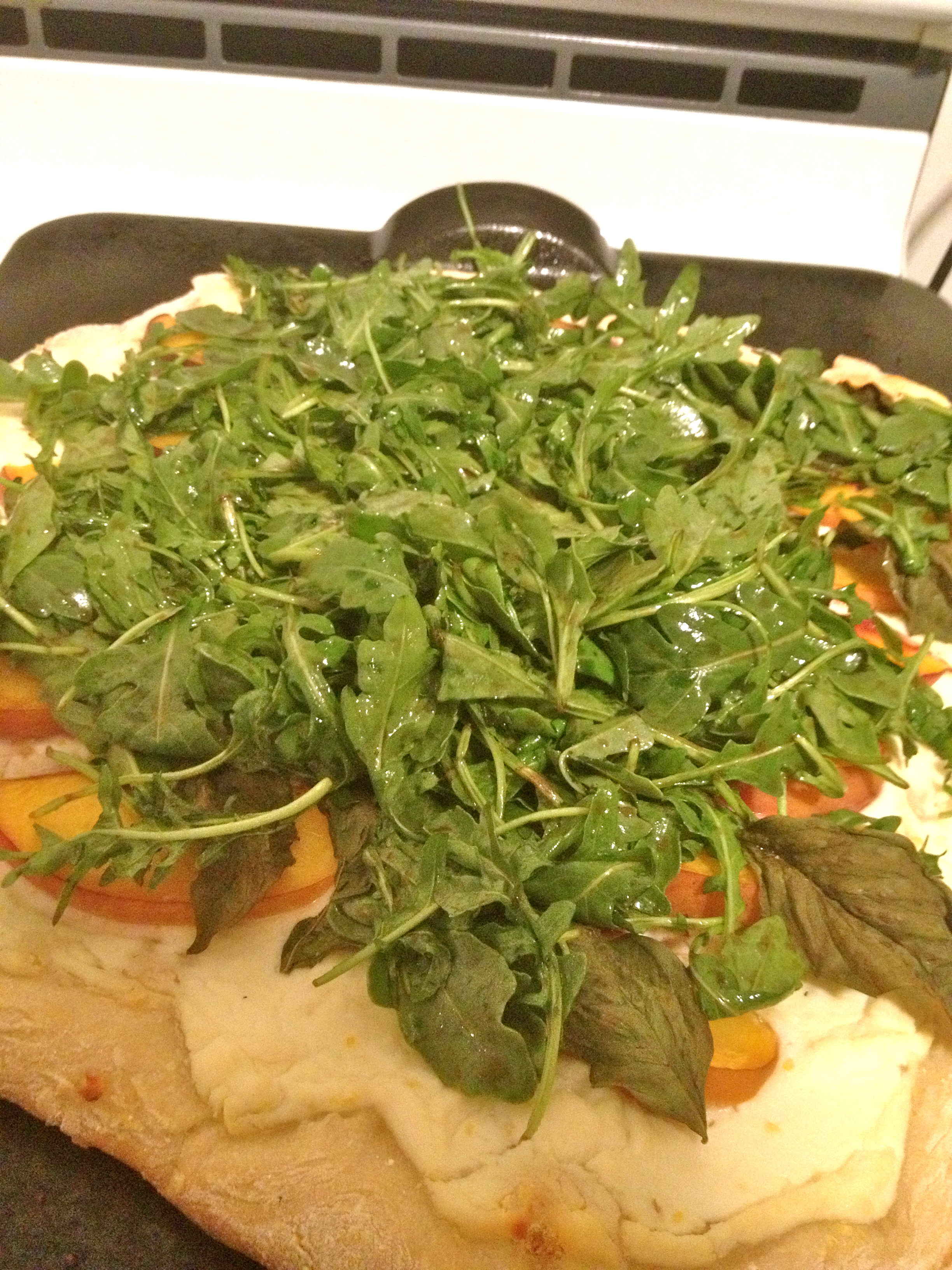 Once the pizza is done, drizzle ¼ cup of the remaining balsamic vinegar on the peach, ricotta and basil topping.  To finish, add the arugula salad to the top of the pizza.  Now you are ready to serve! Bon Appetit!