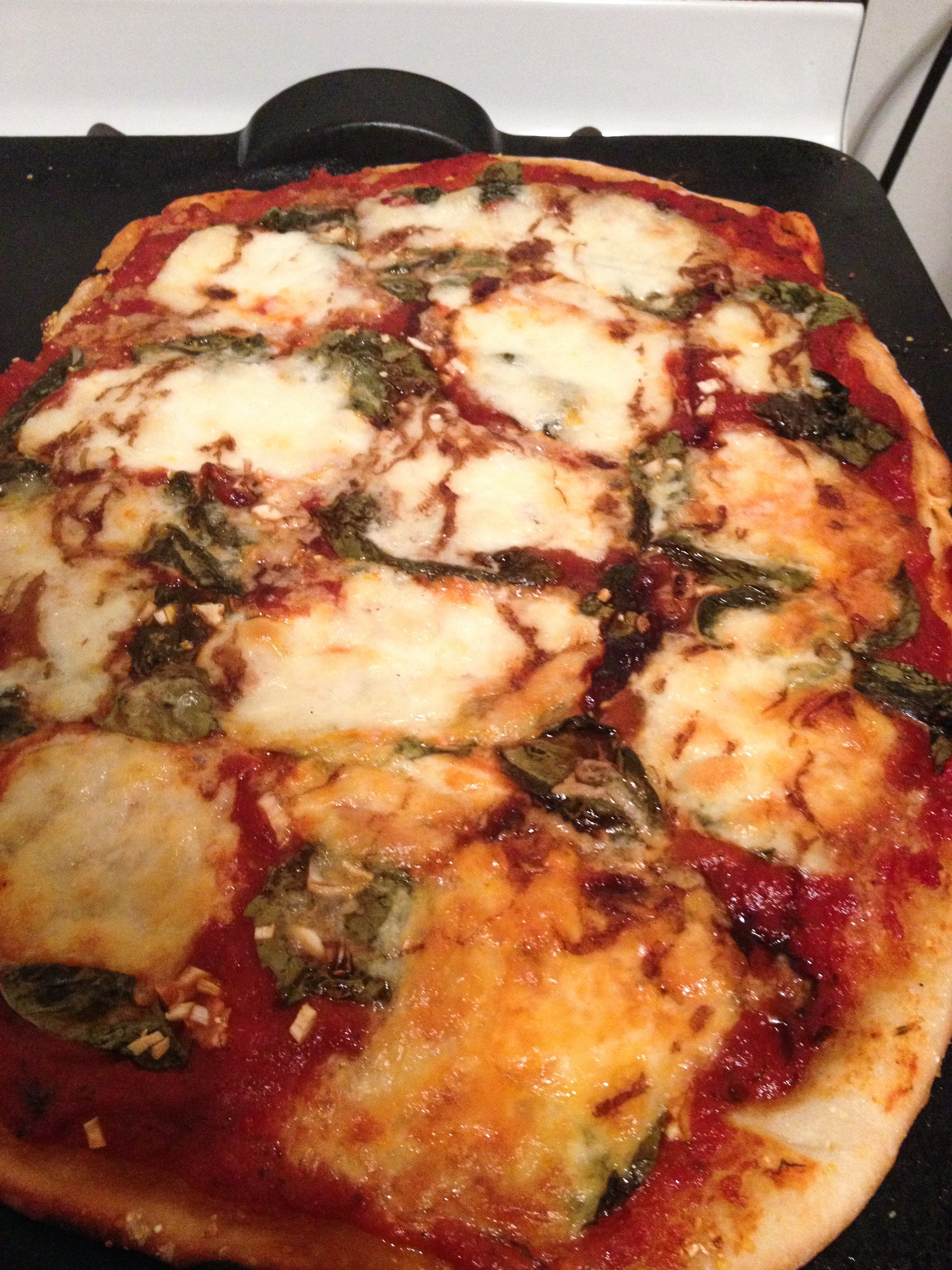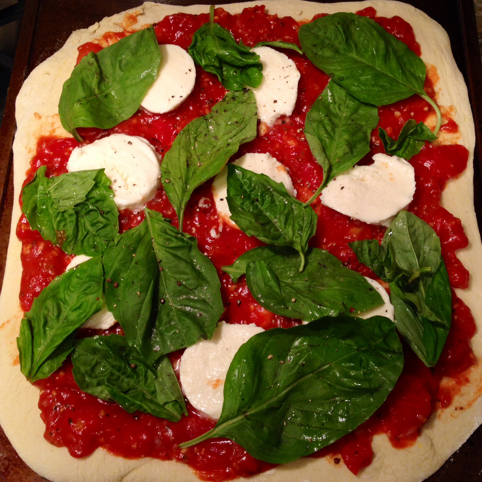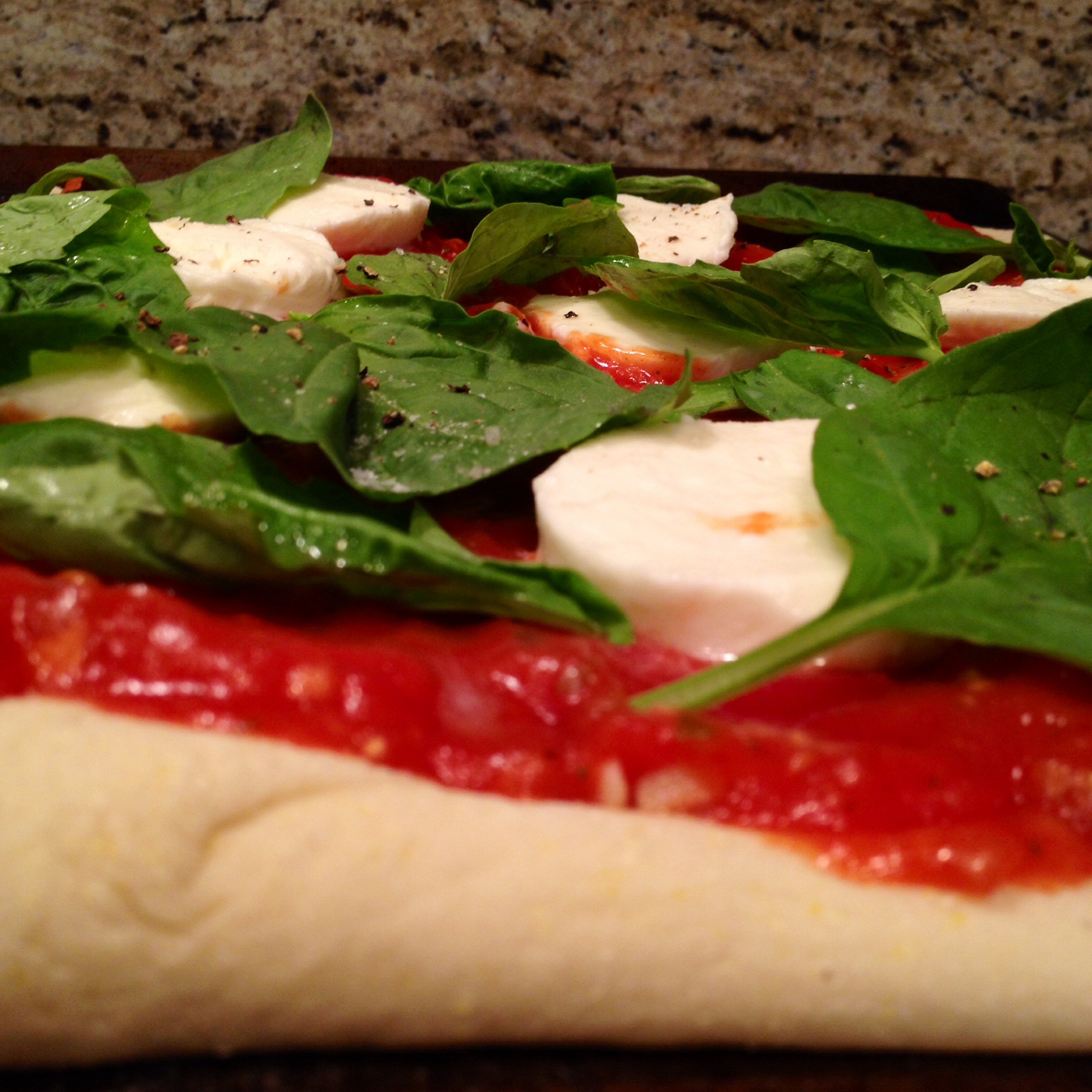 Roll out your pizza dough on a floured/ cornmeal surface. Once evenly rolled out, place dough on a pizza stone. Spread the marinara sauce on the dough making sure you get the edges.