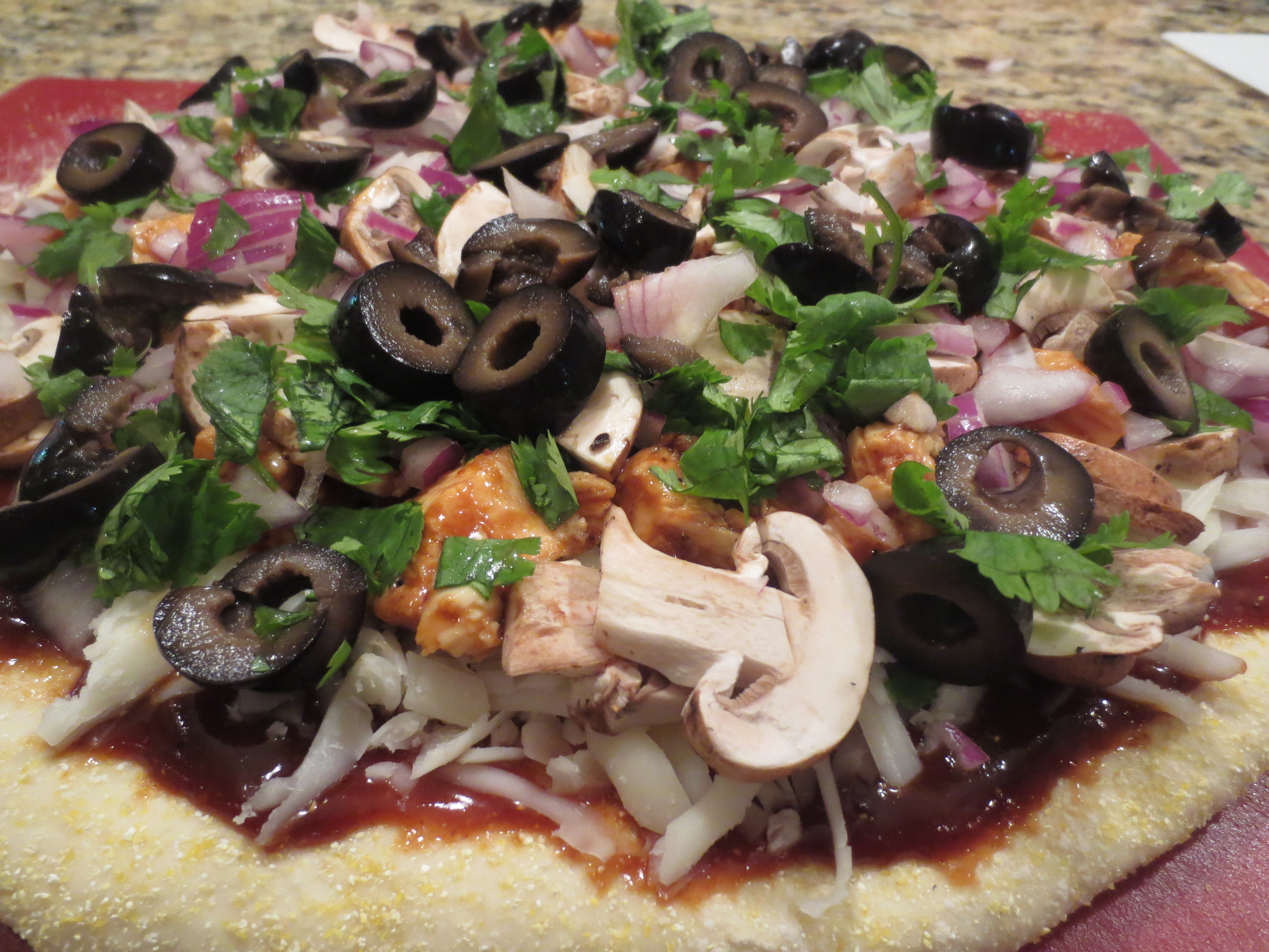 Then, add your mozzarella! Take the sliced olives, mushrooms, cilantro and red onions and spread it on the cheese. In a bowl, mix the shredded chicken breast and BBQ sauce. Once mixed, put the chicken on the pizza.