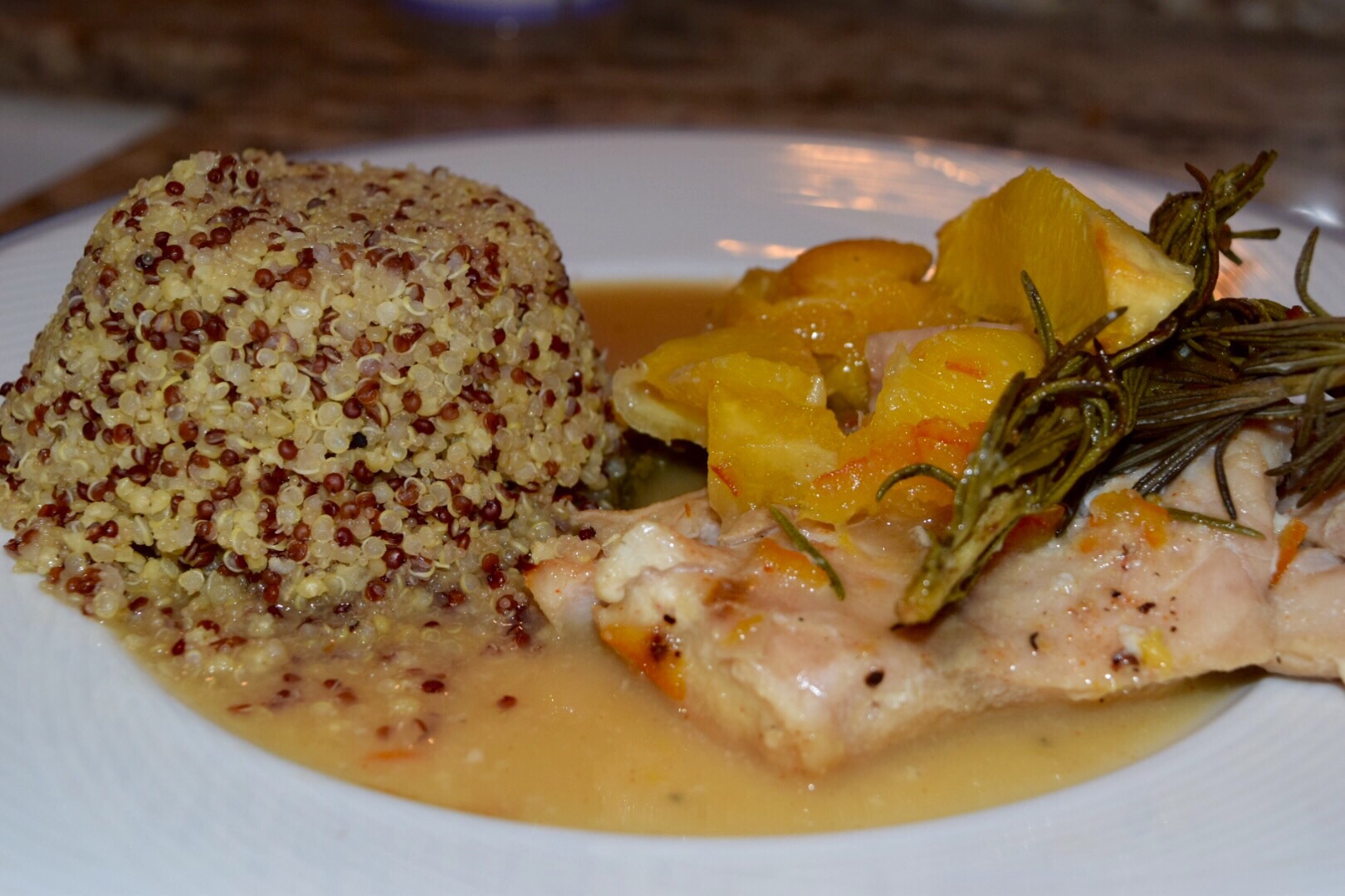 3. Combine orange preserves, wine, water, 2-3 springs of rosemary and ½ of the orange slices in a sauté or sauce pan over medium heat and stir.