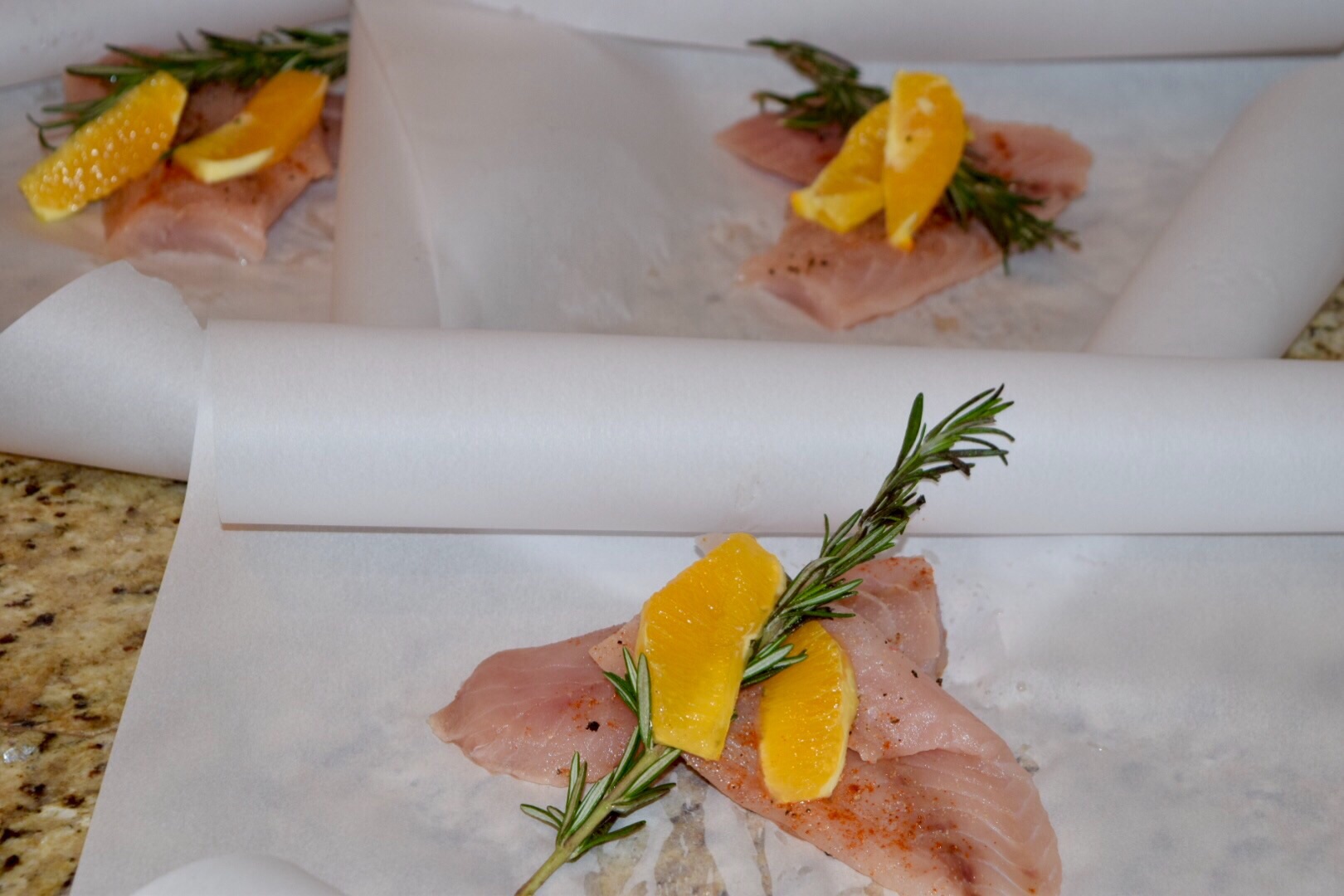 5. Place the fish (2 halves/paper) onto the parchment paper. Add a spring of rosemary and 1-2 slices of oranges. Baste the fish with the orange glaze. Wrap the fish up in the parchment paper and secure with rotisserie twine. Repeat process for the 2 other filets.
