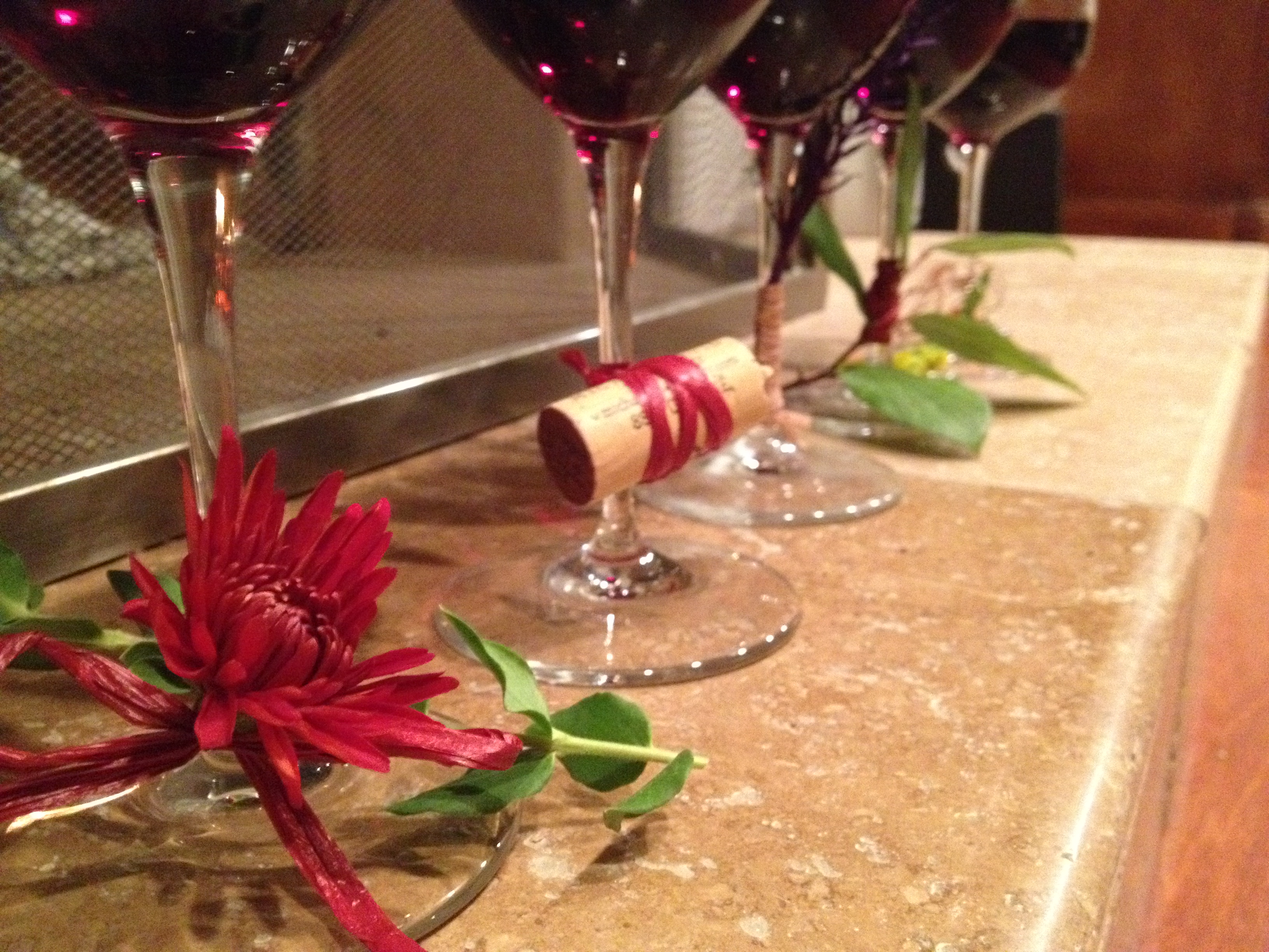 T.W.O. and company decided to make this a DIY craft event! We gave each person some raffia and allowed each person to pick his or her own “identifier.” Some of these items were flowers, wine corks, leaves, and twigs. It was a hit and not one glass was mistaken for another’s!