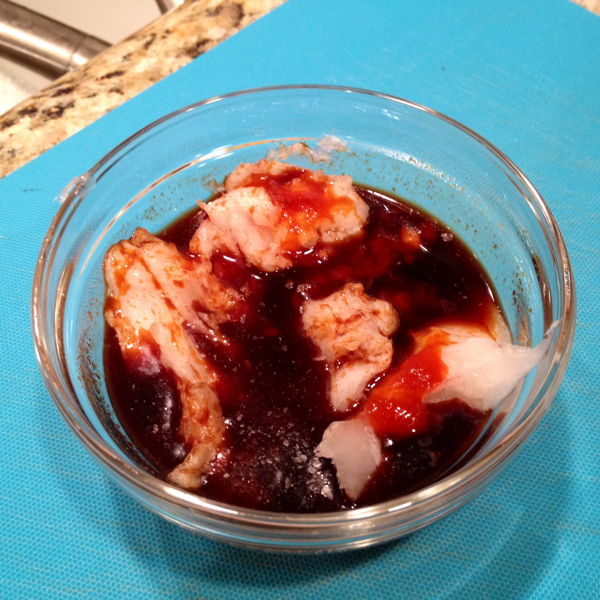 While the rice is cooking, heat oven to 400° F. Combine the melted coconut oil, soy sauce, vinaigrette and Sriracha. Stir vigorously until mixed well.