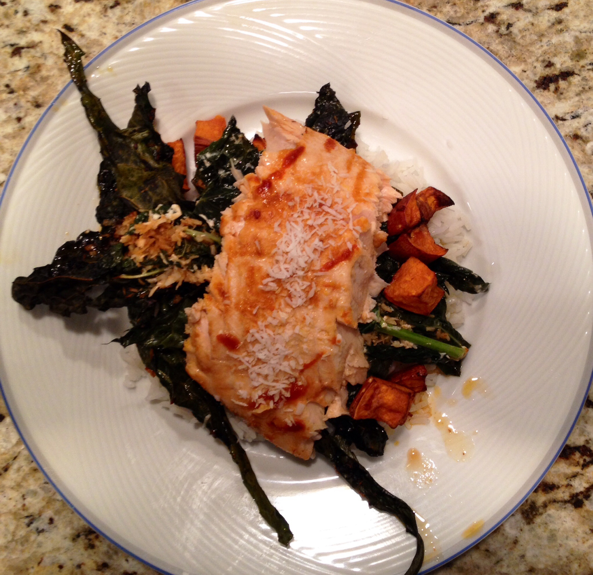 Place kale and coconut flakes on a lined baking sheet. Drizzle with about 2/3 of the dressing. Toss until well coated. Place salmon on top of the kale and drizzle with 1 to 2 tablespoons of the remaining dressing. Bake the salmon and coconut kale mixture during the last 15 minutes of the sweet potato’s baking time, or until cooked through, being careful not to let the kale burn.