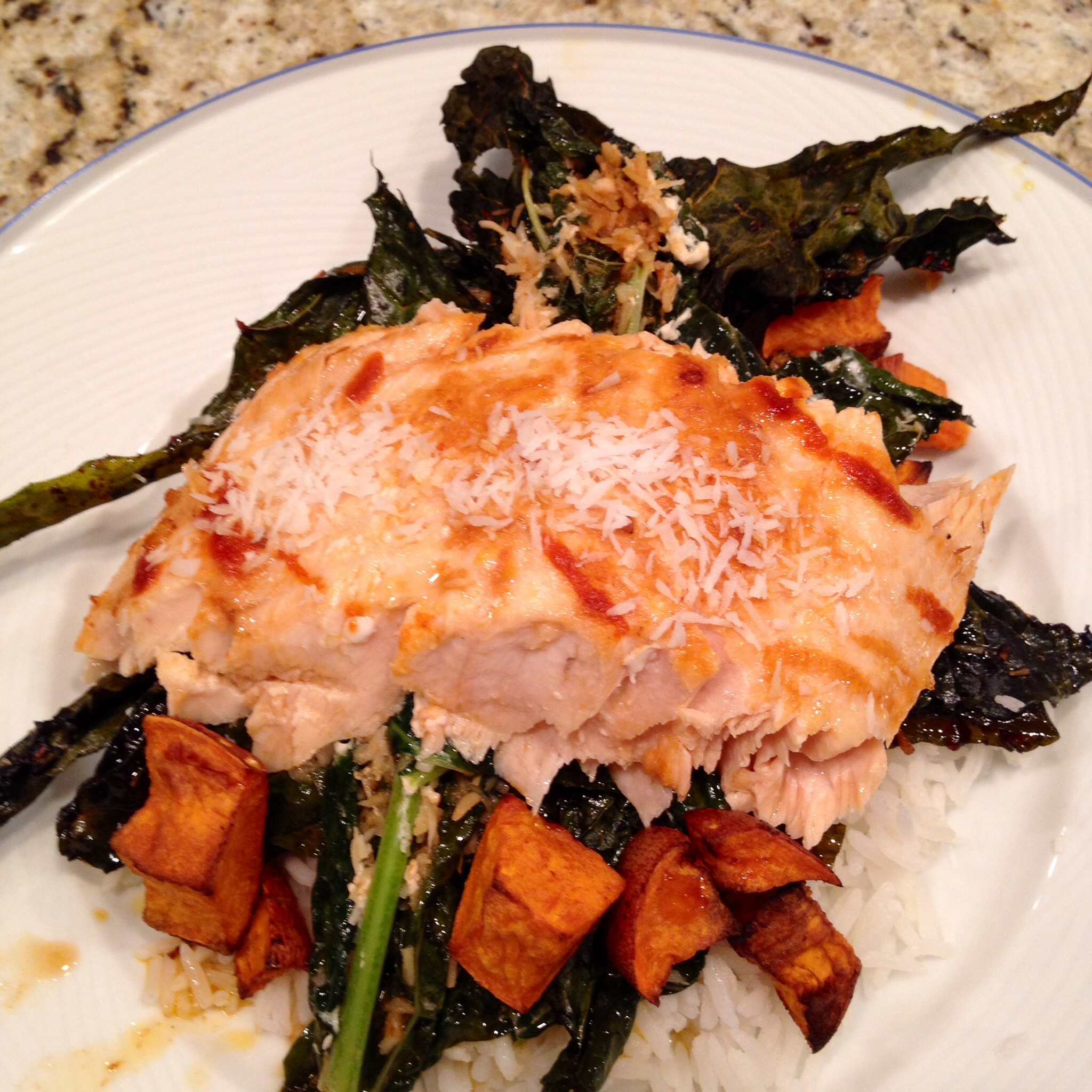 Remove sweet potatoes, salmon, and kale from oven. Serve over fluffed rice with an extra drizzle of dressing.