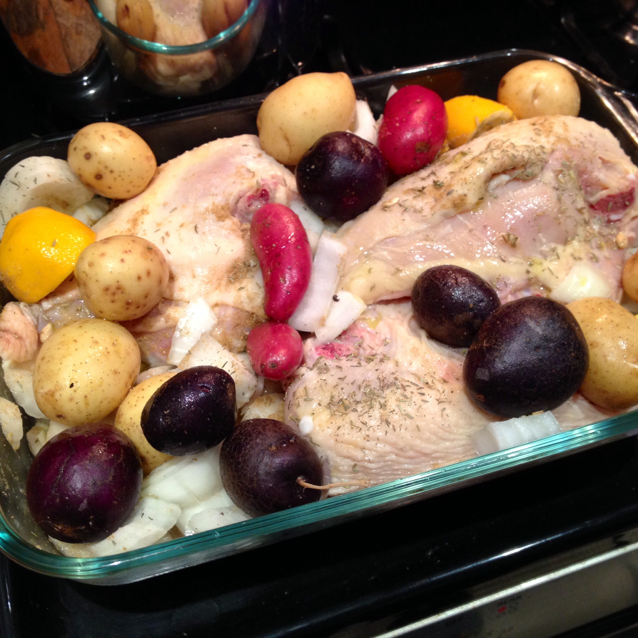 Add the potatoes, onions & garlic. Add 1/2 cup of chicken broth to the bottom of the dish to cover some of the potatoes and the chicken. (It should be about 1/3 of an inch)