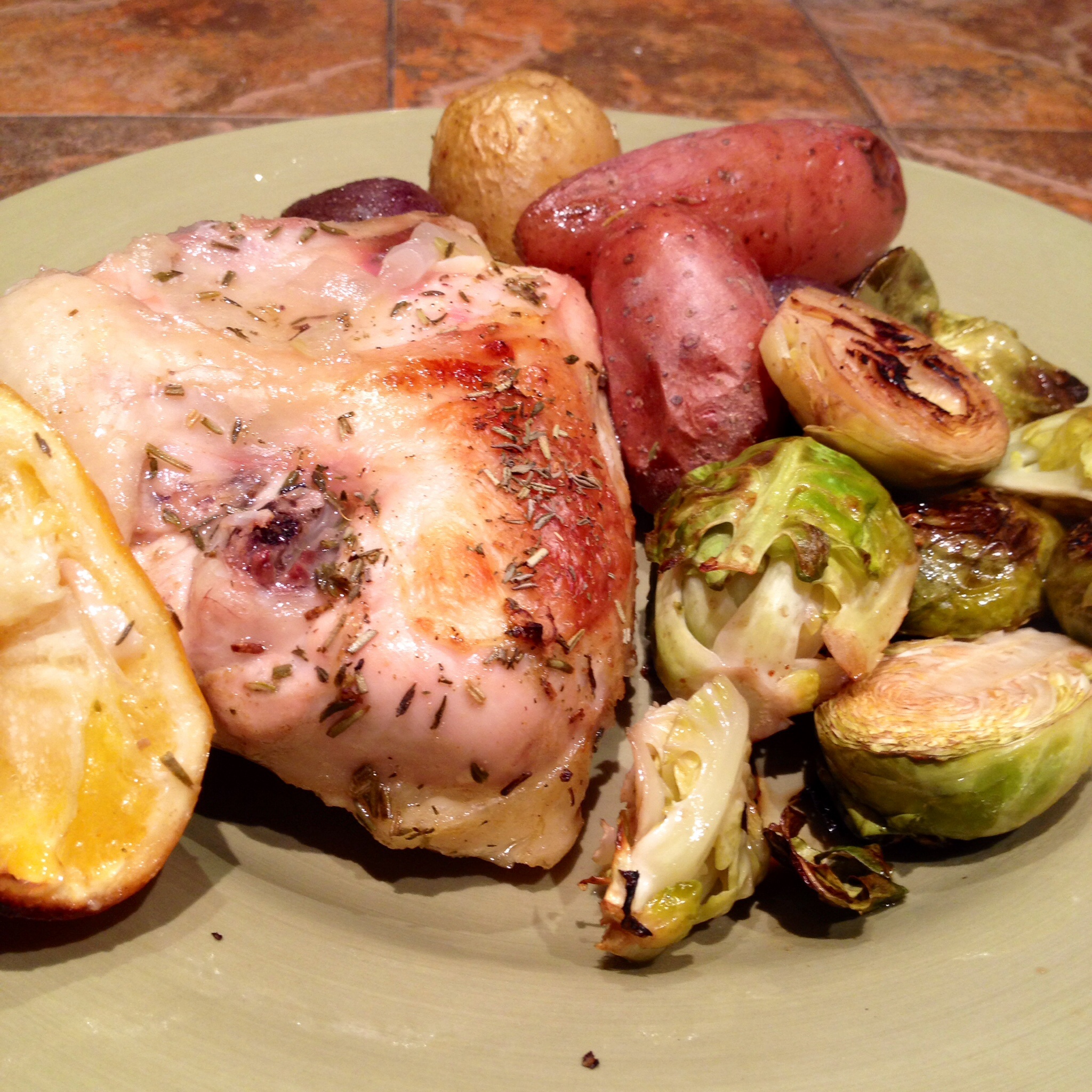 Put in the oven for 25 minutes, then turn the chicken to the other side – skin side up – and leave it to cook for more 25 minutes, till the skin side is roasted. Once the chicken is done, plate the chicken, potatoes, lemon and drizzle with cooked broth. It’s time to eat!