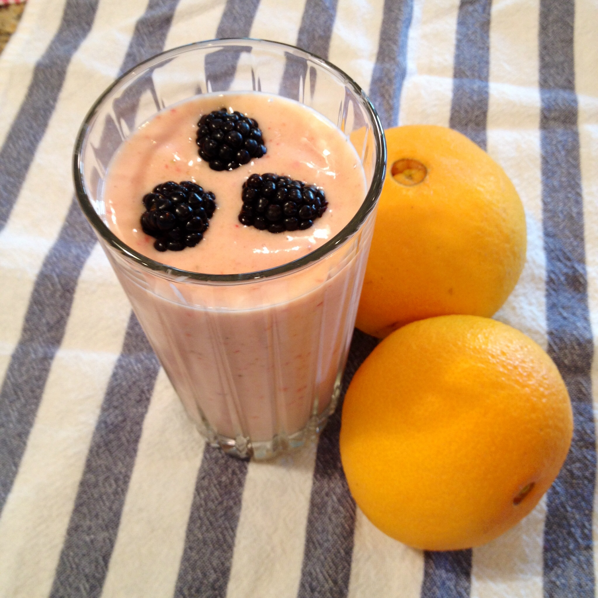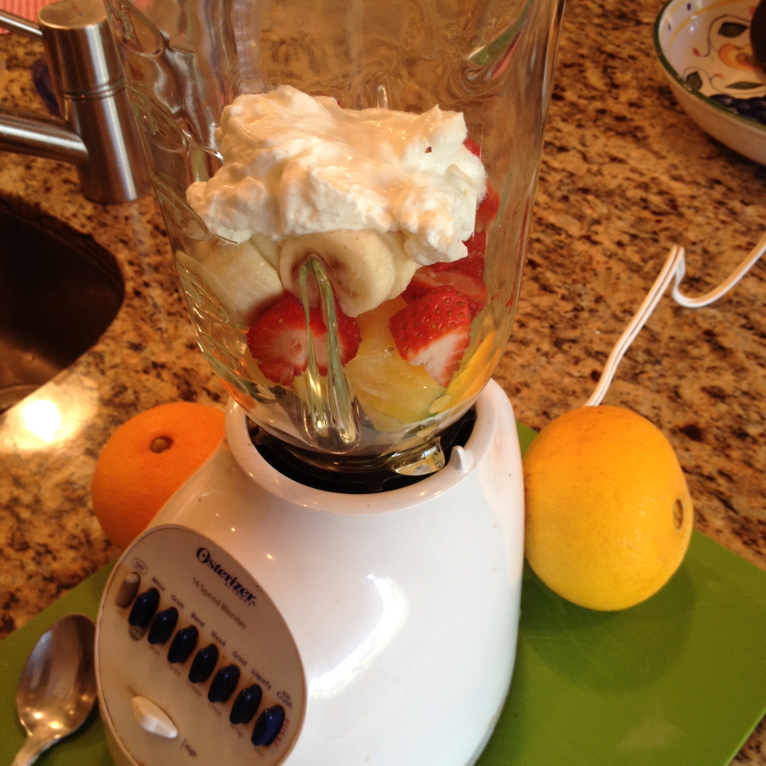 In a blender, mix together the orange cubes, yogurt, banana, strawberries and orange juice. Make sure all the ingredients are blended well. You might have to stop the blender and mix the fruit to ensure that there are no chunks.