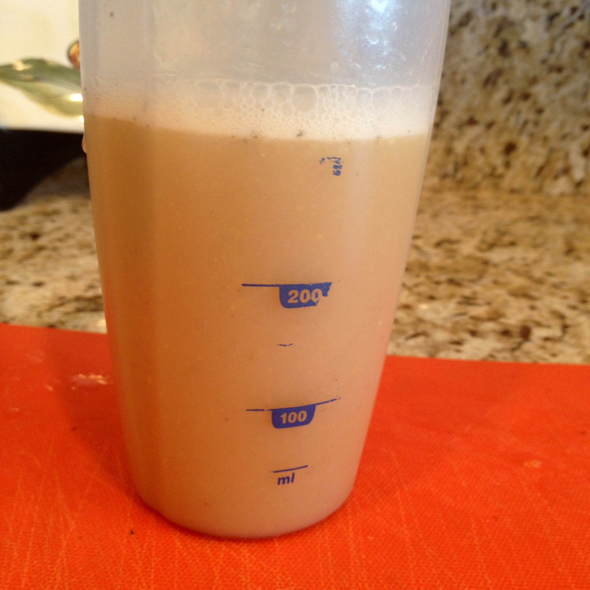 Wash and rinse the kale. Remove core stems and chop. (T.W.O. didn’t remove the entire core stem – just the thick part near the bottom. We like the little crunch in our salad!) Place in a bowl. Add the chickpeas. Chopped the carrots in thick slices and add to the salad mixture. The thinner the slices, the soggier the carrots will get as the salad marinates…. So thick slices work best!
