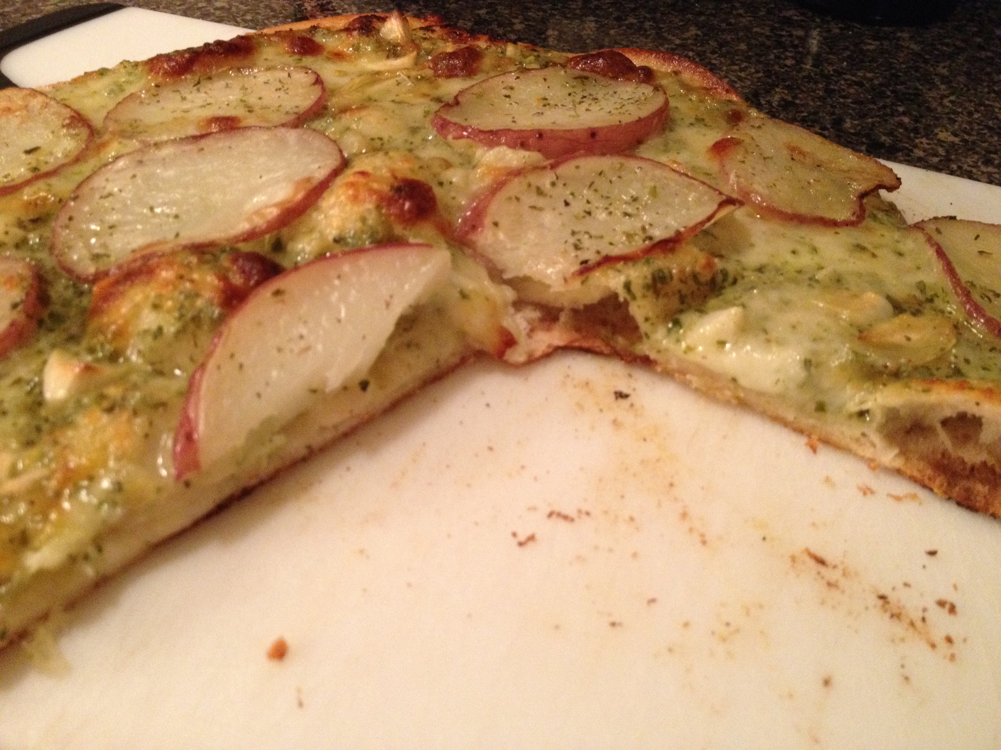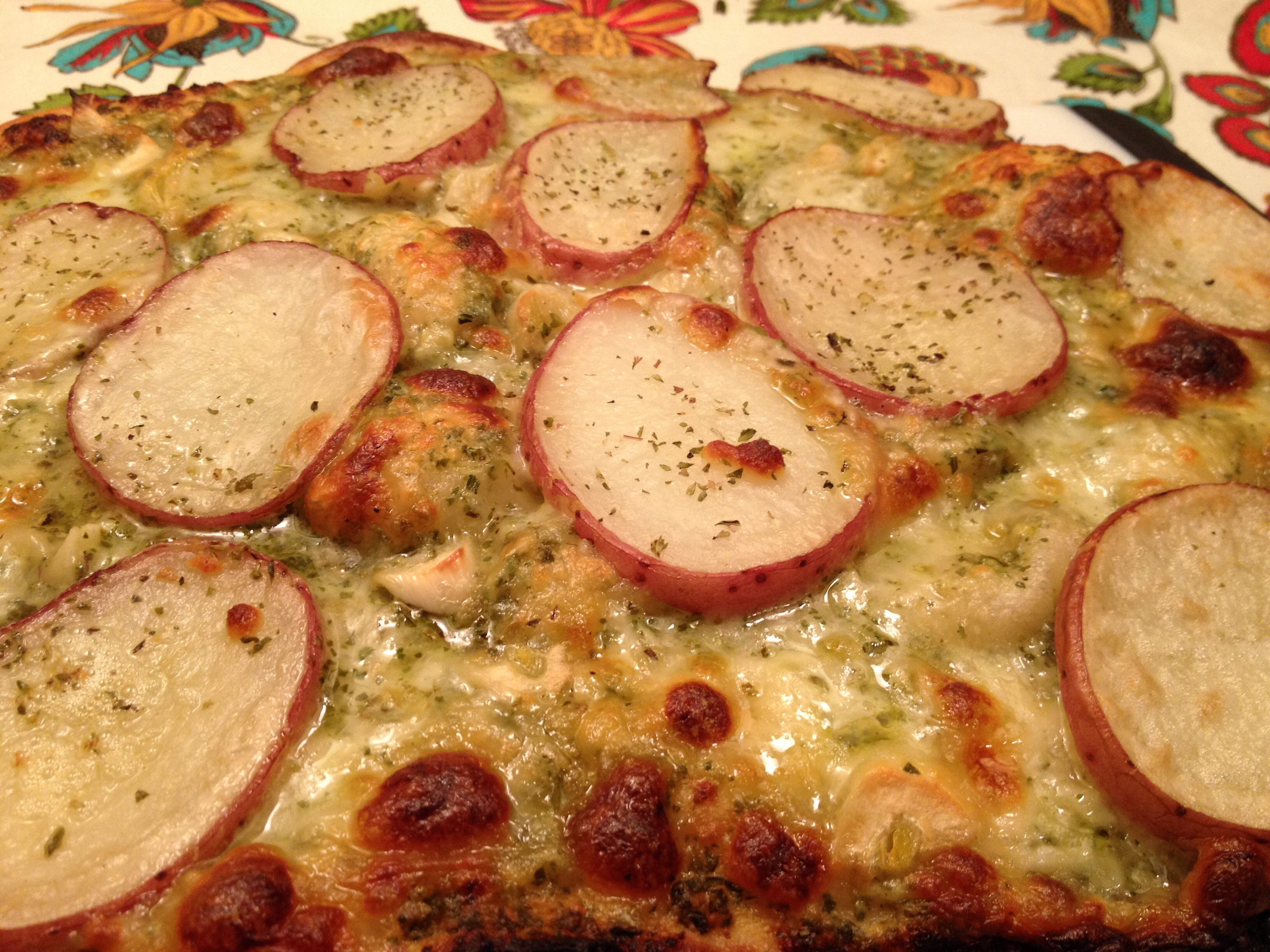 Friday Night Pizza Night with T.W.O.! This week we are featuring a hearty pizza that includes pesto, potatoes and garlic. We adapted the recipe from one of our favorite pizza parlors in San Francisco – ZA Pizza! We hope you enjoy it as much as we do!