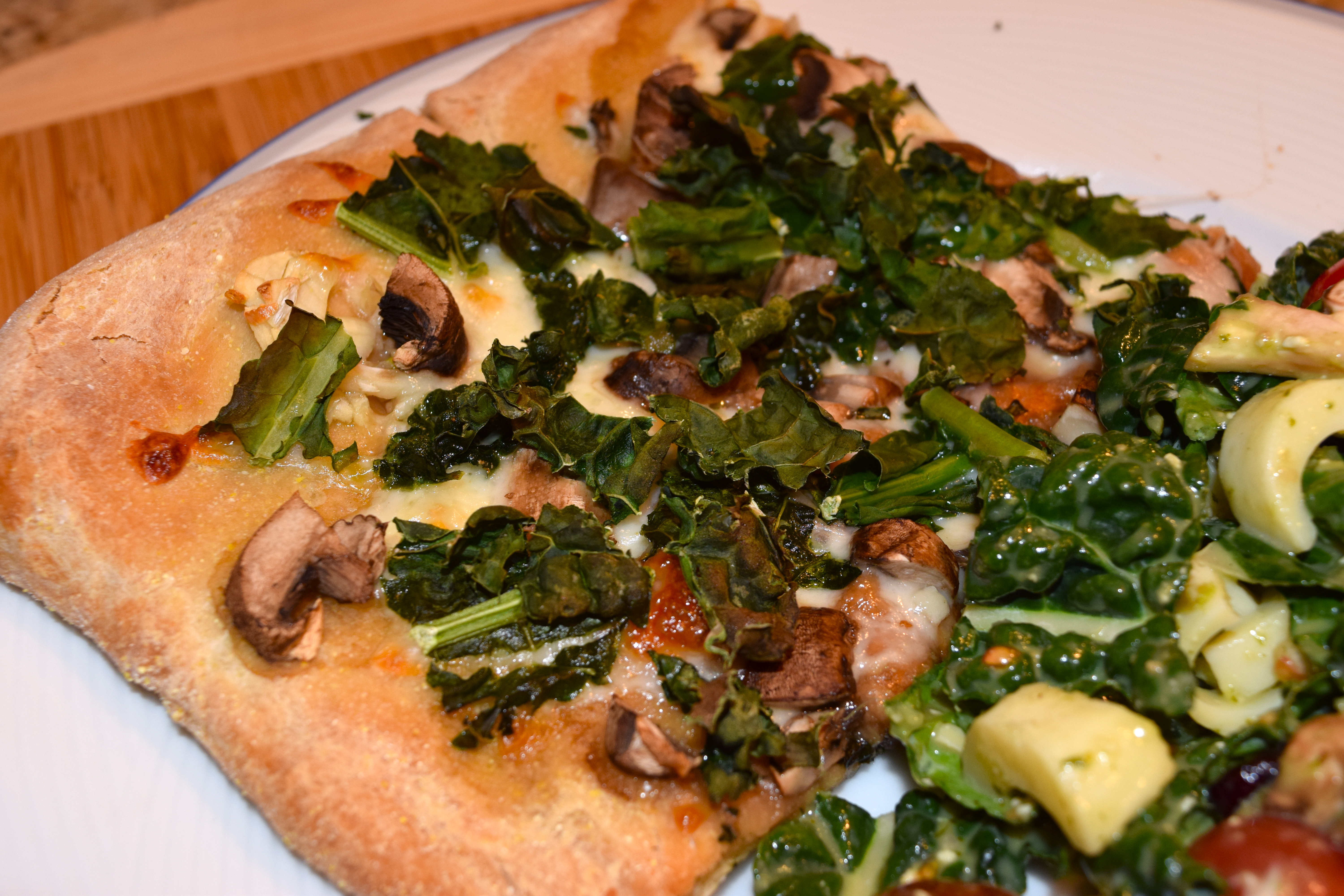 Roll out the pizza dough on a floured/ cornmeal surface. Once the dough is evenly rolled out, transfer the dough to a greased cookie sheet. Next, spread the pesto onto the dough, making sure you reach all the edges. Then sprinkle the mozzarella to the pizza. Spread the garlic evenly on top of cheese along with the artichoke hearts and mushrooms.