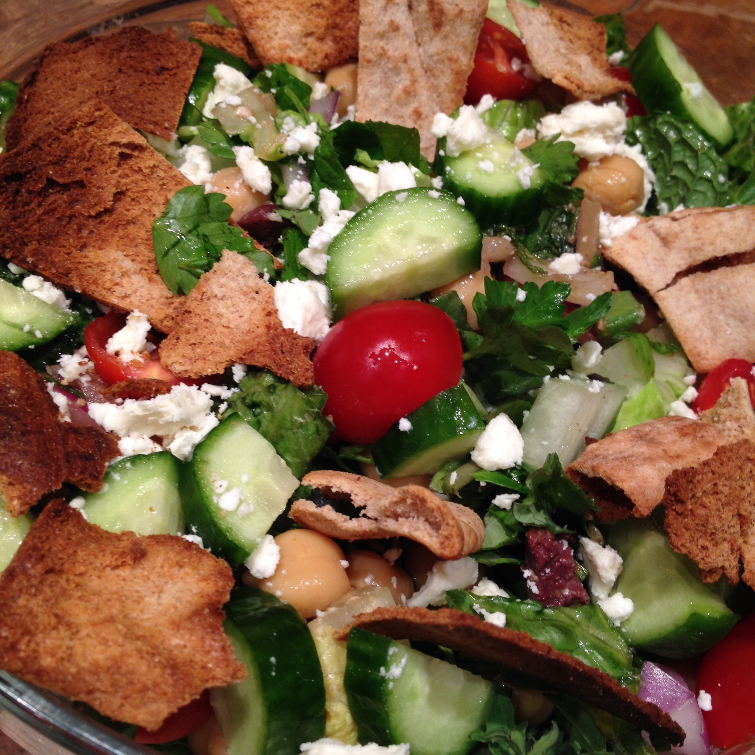 4. For the salad, plate mixed greens. Chop up the cucumbers, tomatoes, mushrooms and green onions and place on top of the greens. Add the garbanzo beans and feta cheese. When the steaks are done, slice thinly and place on salad. Add the sweet potato chips while still hot.