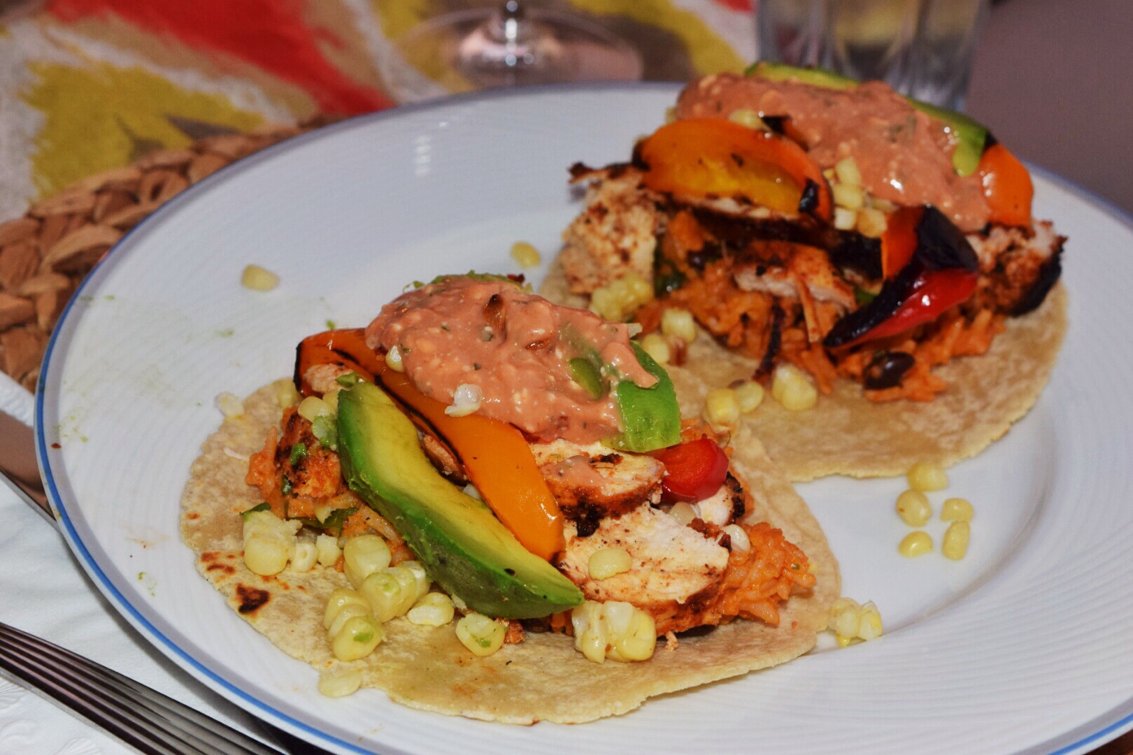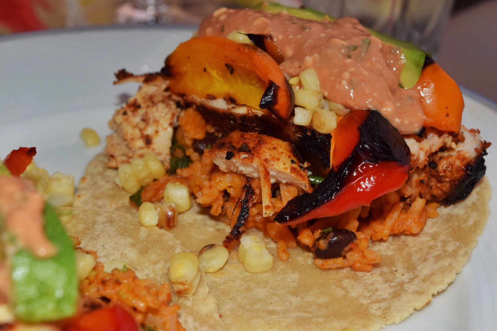 6. To assemble add the cheesy rice to the center of a warm tortilla. Add the chicken and peppers. Garnish with fresh cilantro and diced avocado. Drizzle with the Tex-Mex Special Sauce.