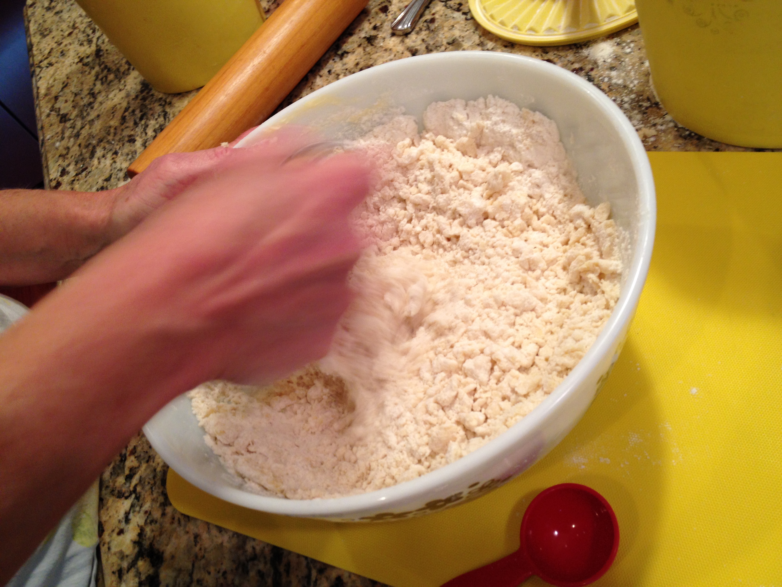 Preheat oven to 425 degrees. In a bowl mix the flour, shortening, sugar and cold water. T.W.O. uses a pastry blender to mix the dough together, forming into a ball.
