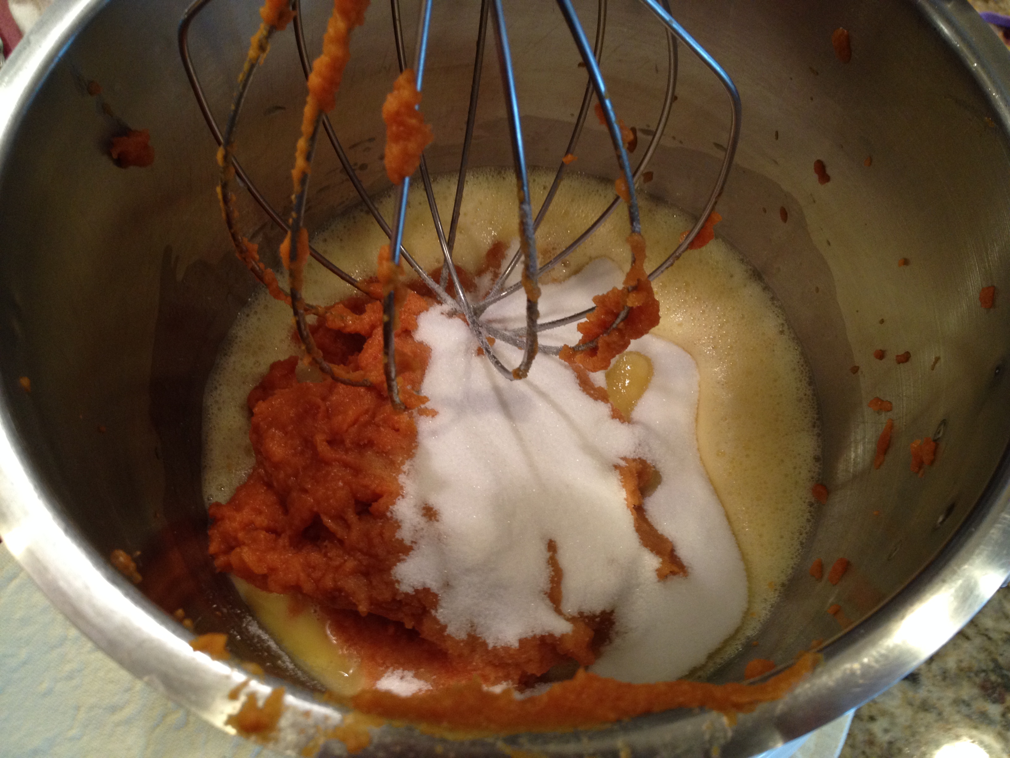 Now for the pumpkin filling. Mix sugar, cinnamon, ginger, and cloves in small bowl (T.W.O. uses a KitchenAid). Beat eggs in a large bowl. Stir in pumpkin and sugar-spice mixture. Gradually stir in evaporated milk.