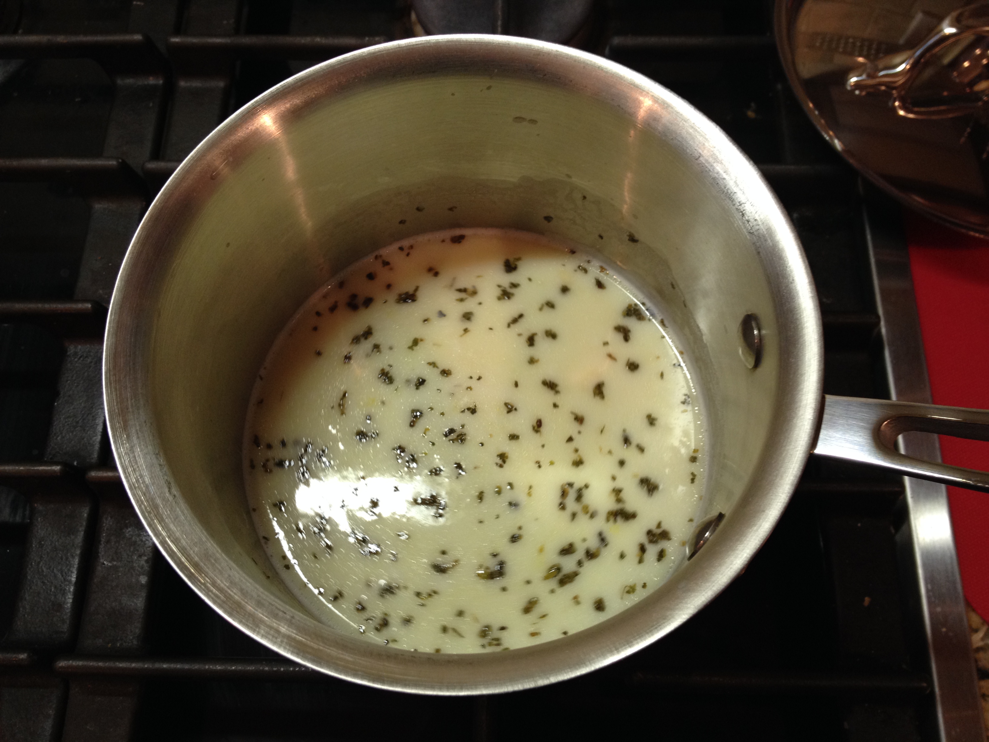 In a small saucepan, combine the broth, cream, garlic and basil. Bring to a boil. Take it from the heat and let the flavors infuse as you assemble the potatoes.