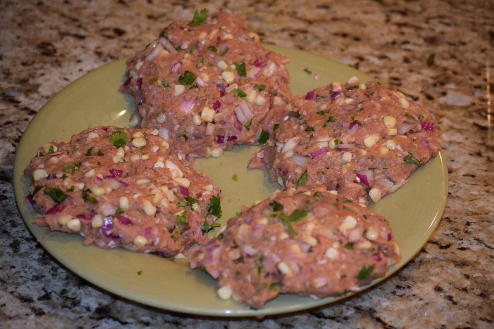 2. In a large bowl, combine the turkey, corn, cilantro, jalapeño, red onion, sriracha, garlic, cumin, corainer, salt and pepper