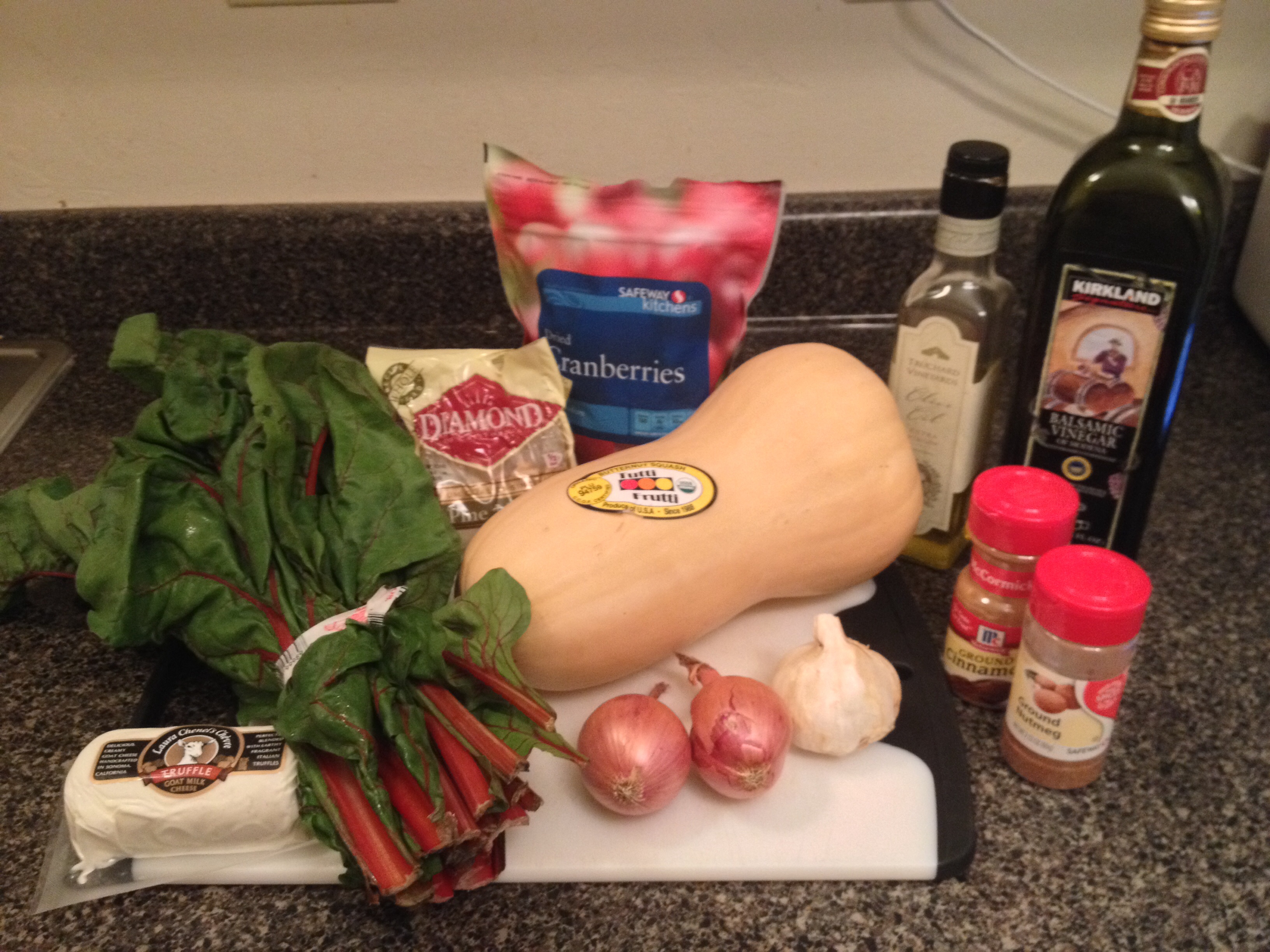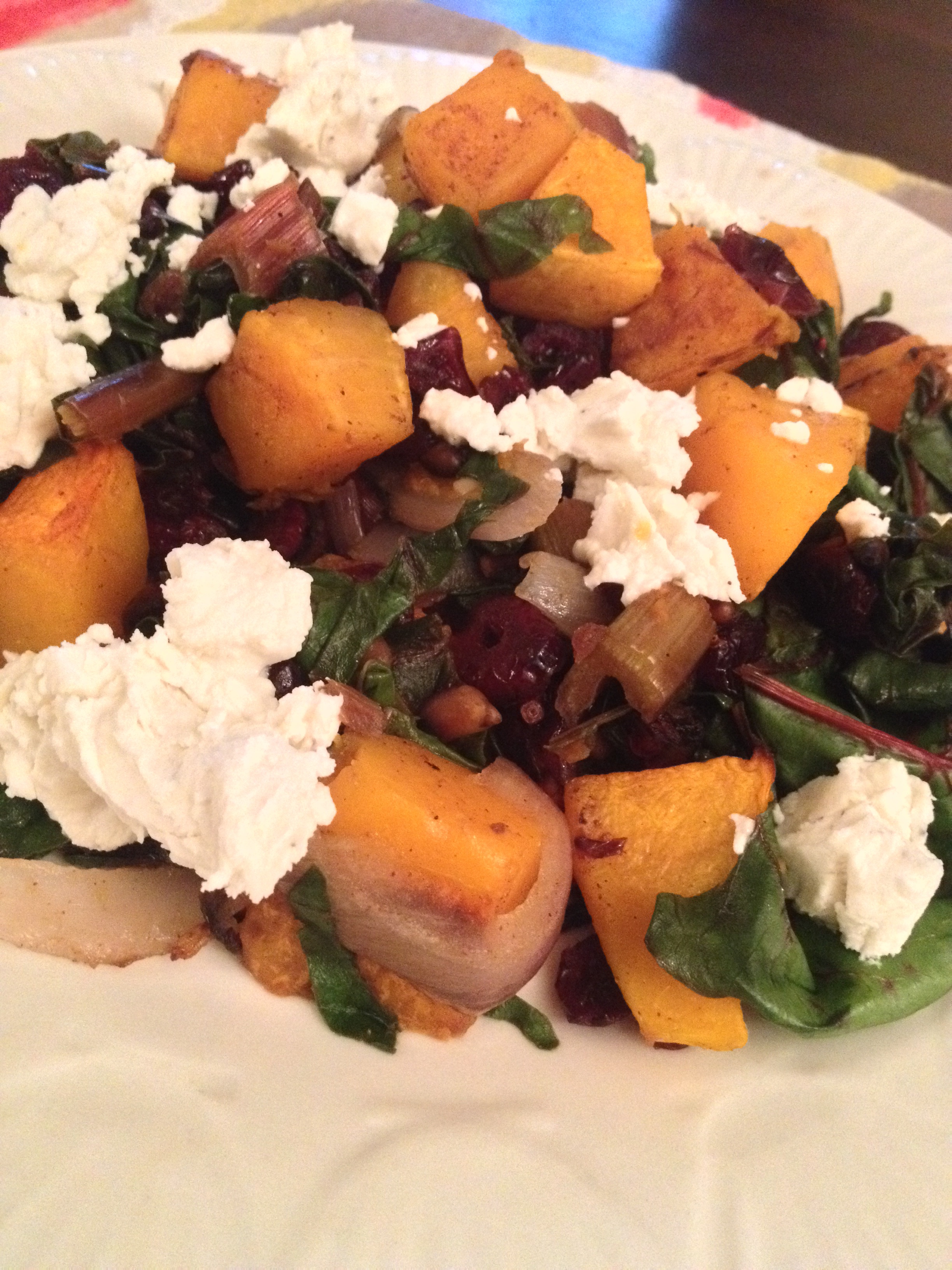 Remove the squash, shallots and garlic from the oven and add to the Swish chard mixture. Once mixed, remove from stove and plate the ingredients. Add the goat cheese to the top for garnish. Serve immediately.