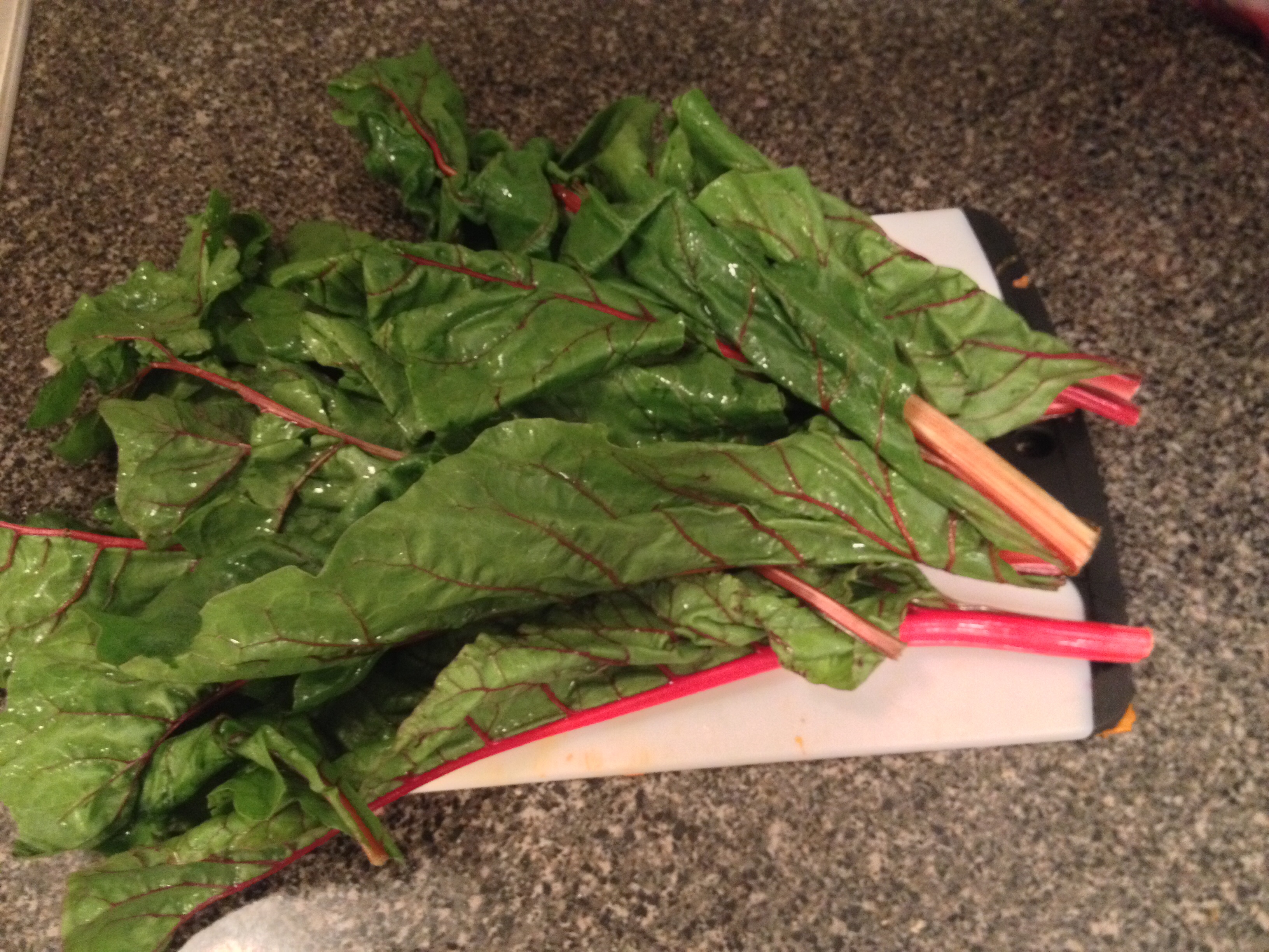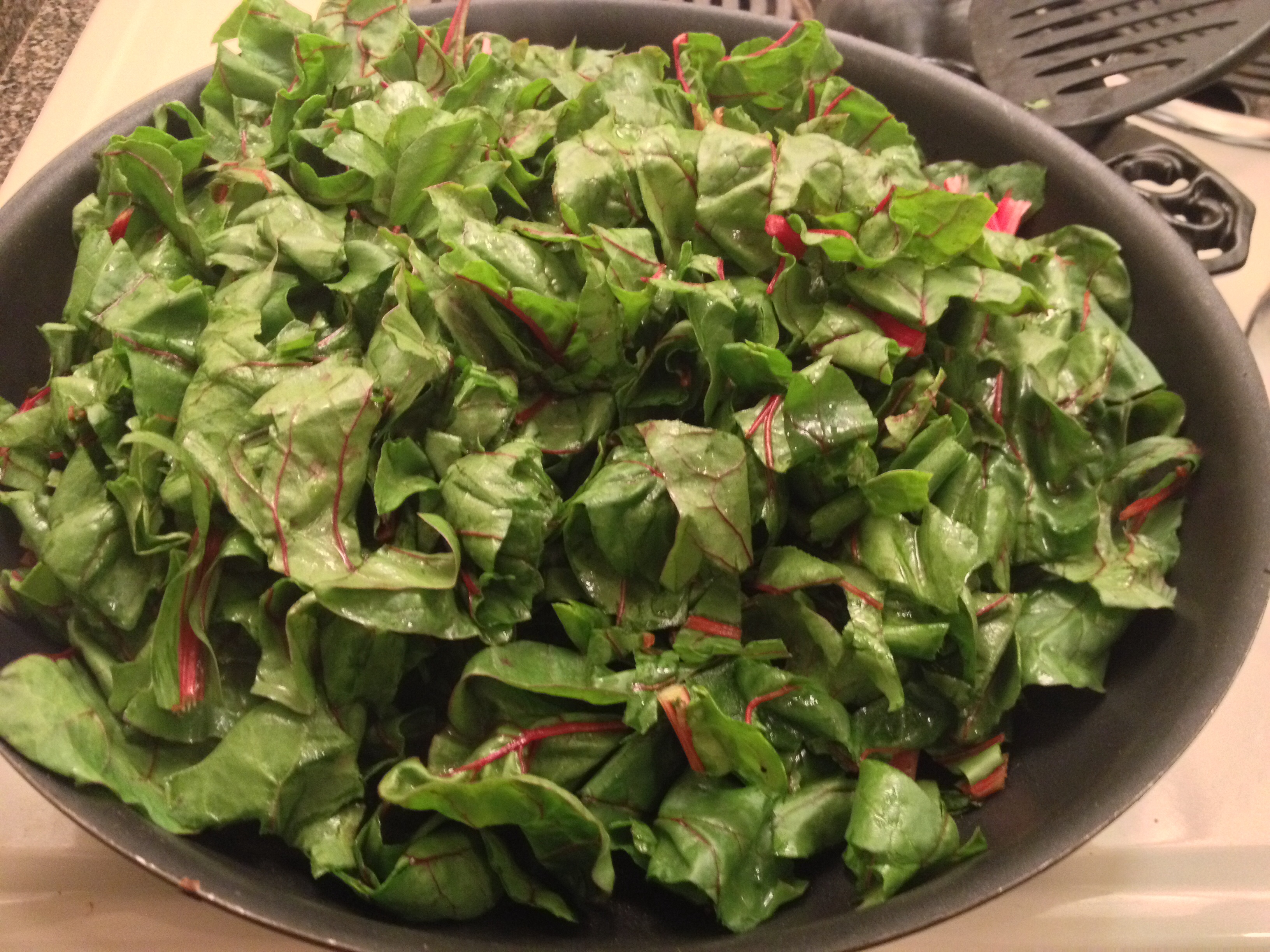 While the squash medley is cooking, chop the Swish chard stems and sauté in a fry pan for 3 minutes with a drixzle of balsamic vinegar. After 2 minutes, add the Swish chard leaves.
