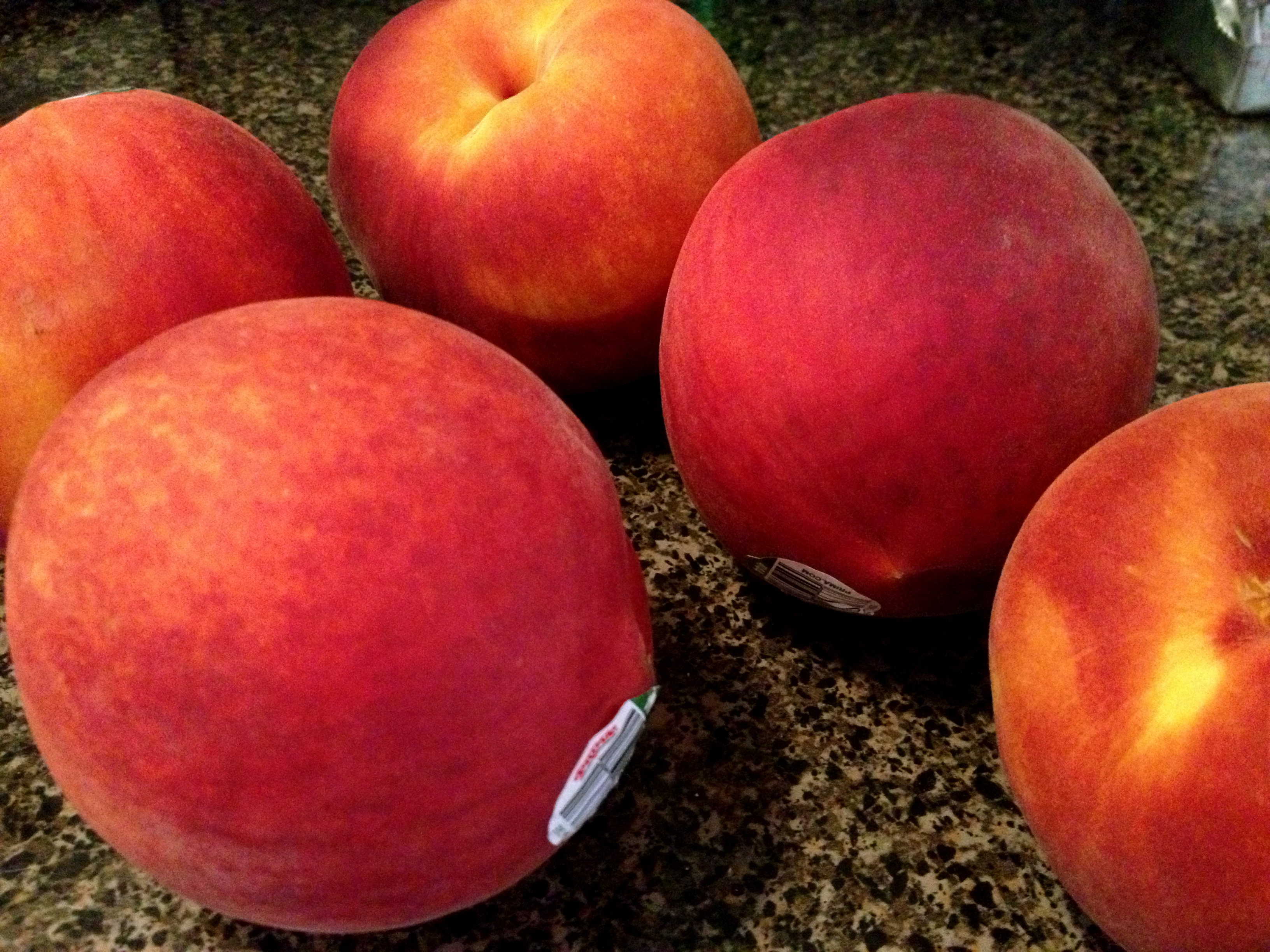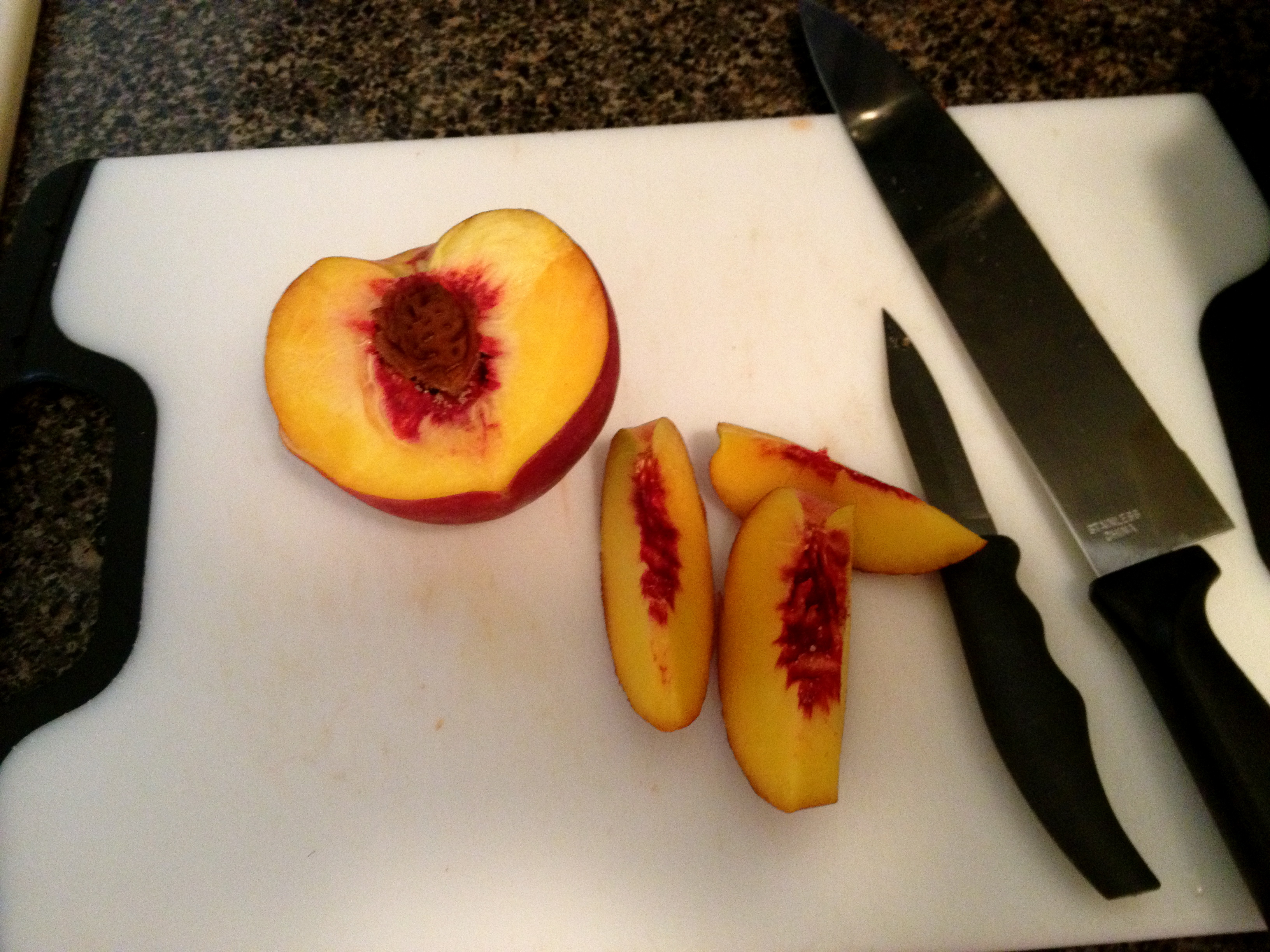 Now for the filling! Make sure the peaches are washed and dried well. You don’t want extra protein in your pie! There are two ways you can remove the skin from the peaches…either blanch them in water or peel the skins off or you can take a carving knife and remove the skin like a peeler. T.W.O. removed the skin using a small knife.