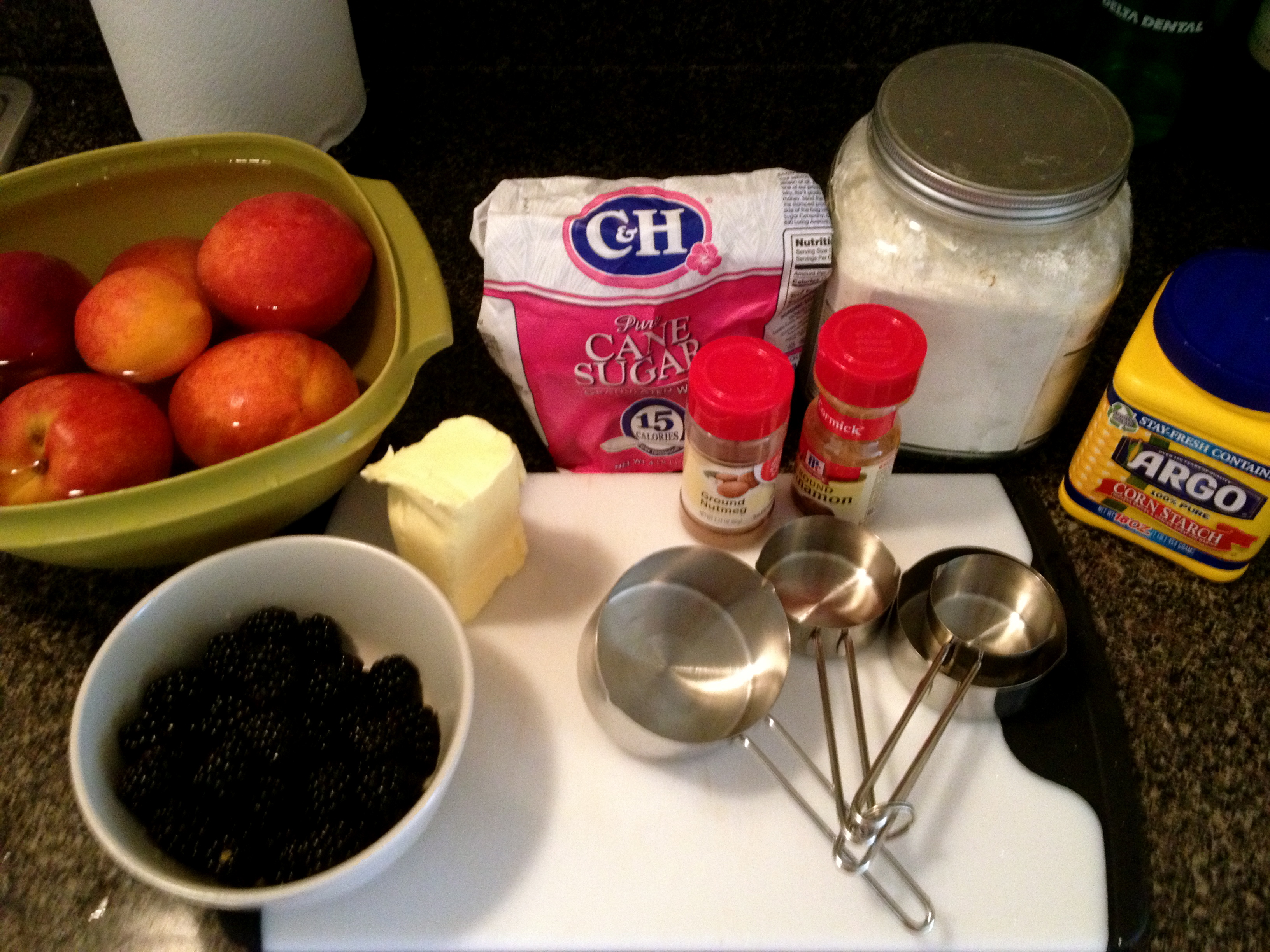 Halve the peaches and remove the pit. Cut the peaches in thin slices and place in a bowl. Once all the peaches are sliced, add the nutmeg, cinnamon, sugar and boysenberries. Mix well, but not too much since you don’t want the fruit to break.