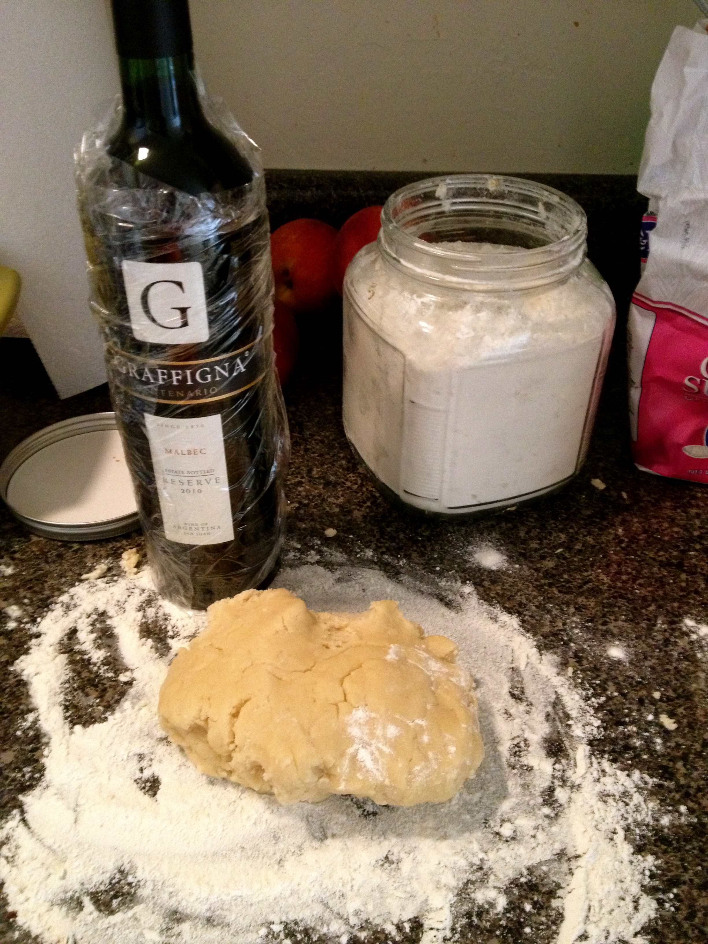 Almost there! Now it’s time for the lattice. Roll the remanding dough out thinly with your rolling pin/ wine bottle to form a rectangle. Take a sharp knife and cut long stripes in the dough. Use these stripes to create the lattice formation for the topper. Be creative with your placement!