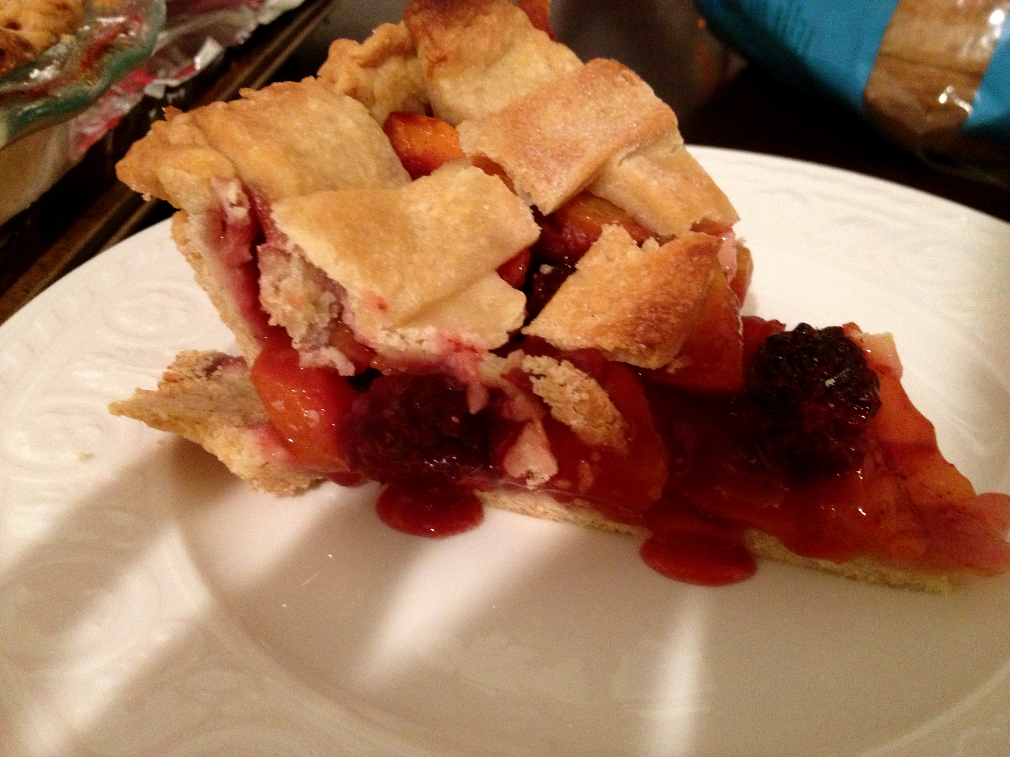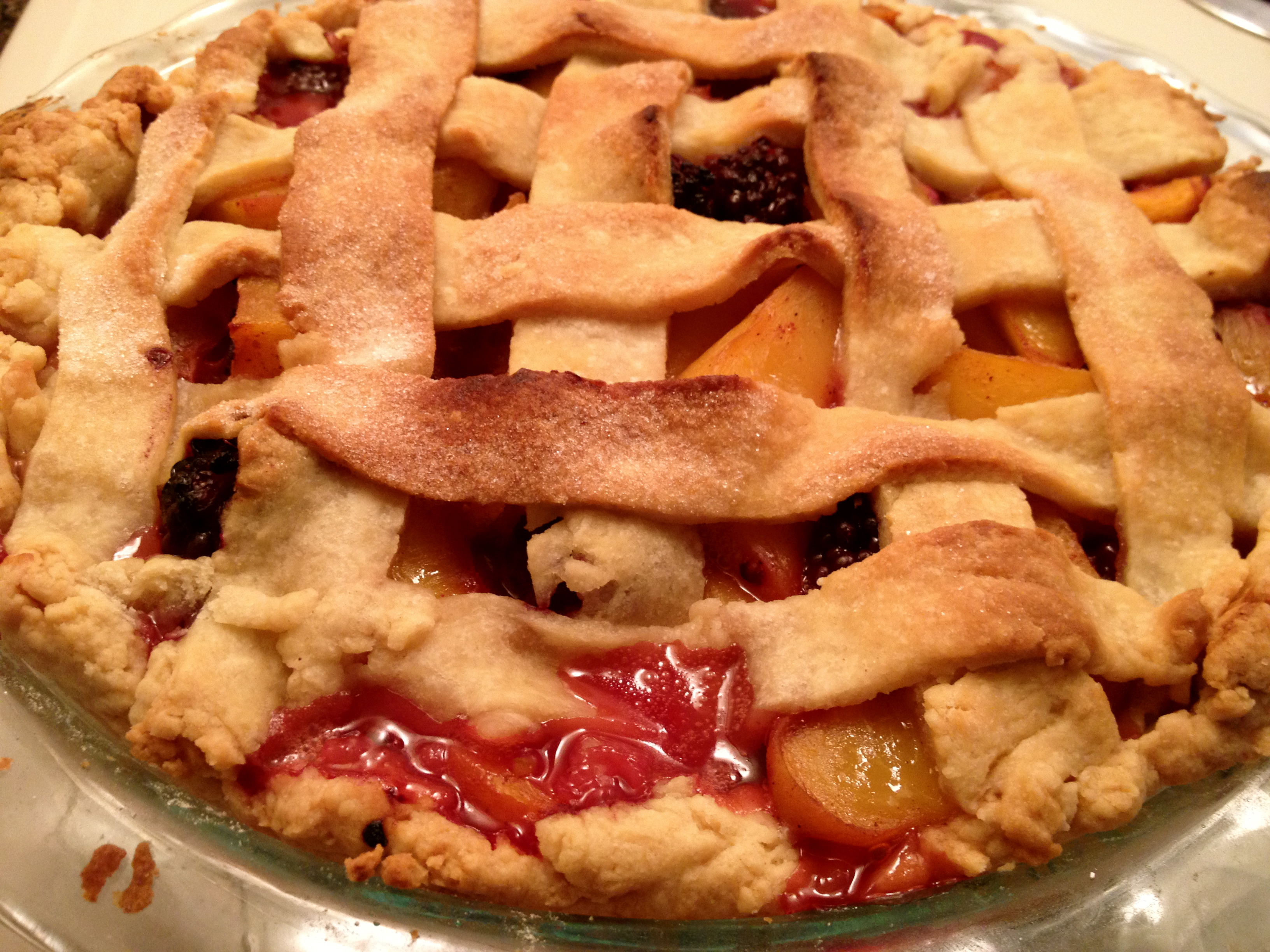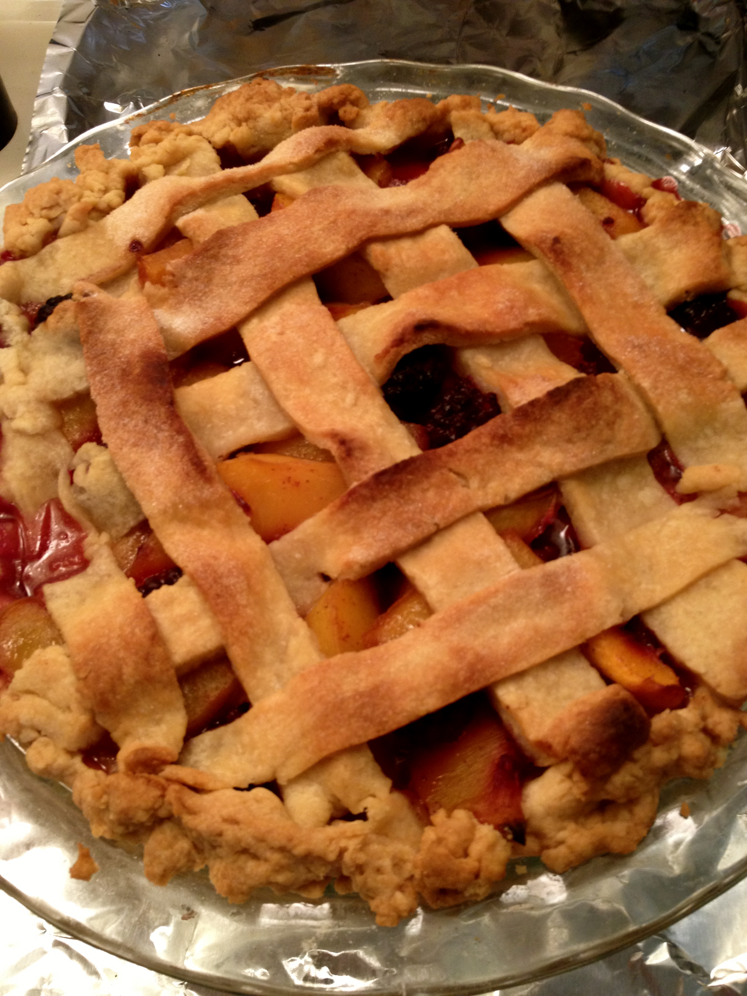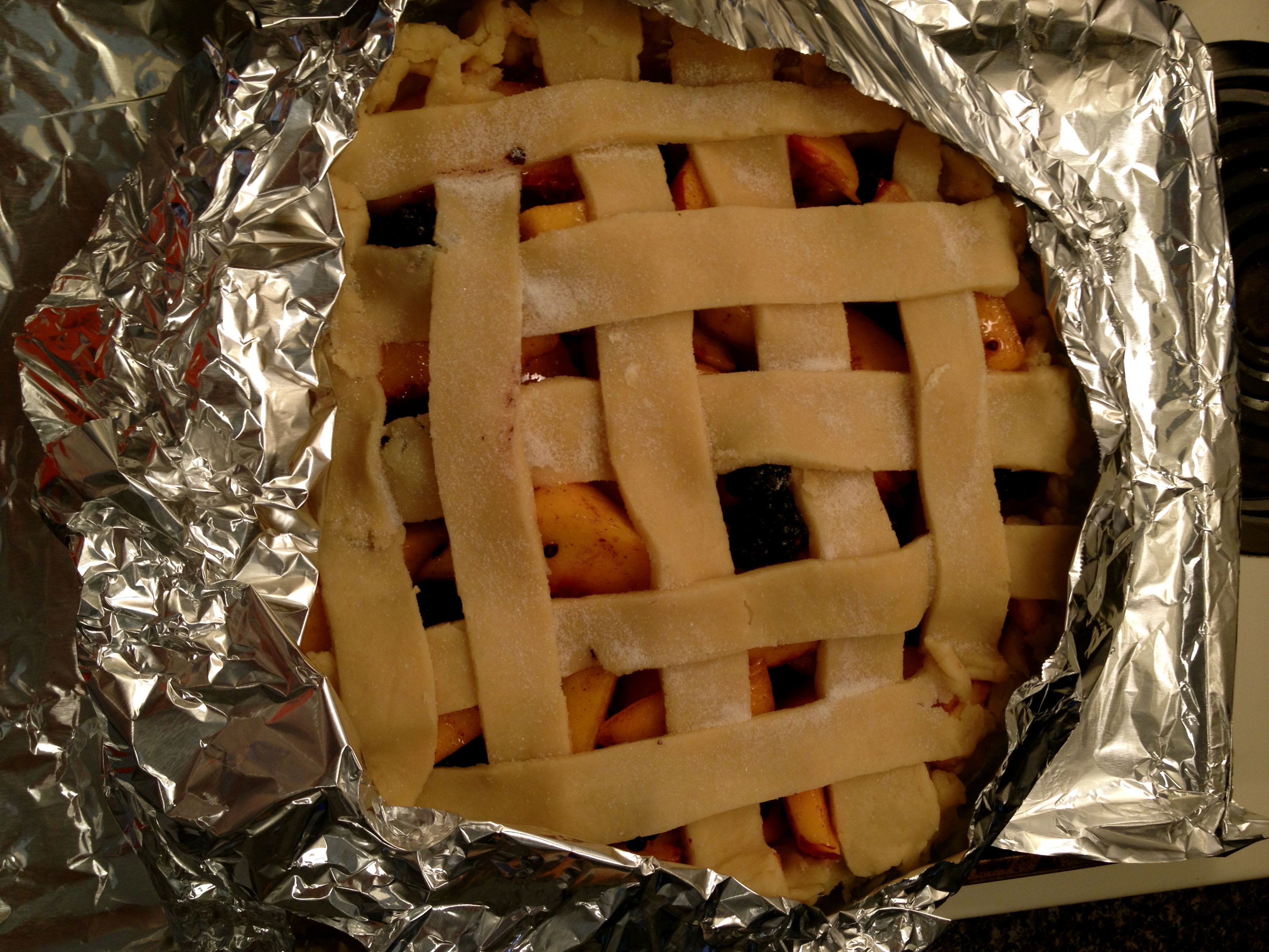 Place the pie dish on a cookie sheet lined with foil to prevent any excess juice from the pie to drip onto the bottom of the oven. Also, put foil around the pie crush so that it doesn’t burn. It’s oven time! The pie should take about 45 minutes, but let’s face it, not all ovens are the same, so just keep an eye on it! T.W.O. knows the pie is ready when the juices are bubbling!